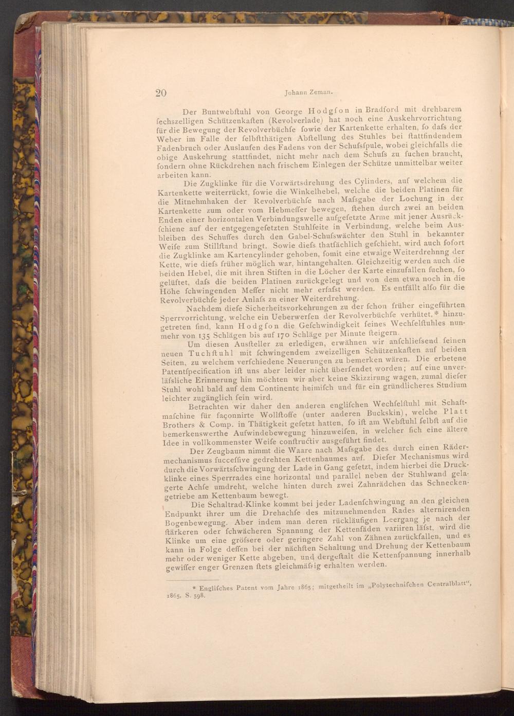Um diesen Ausfteller zu erledigen, erwähnen wir anfchliefsend feinen neuen Tuchft uhl mit fchwingendem zweizelligen Schützenkaften auf beiden Seiten, zu welchem verfchiedene Neuerungen zu bemerken wären. Die erbetene Patentfpecification ift uns aber leider nicht überfendet worden; auf eine unverläfsliche Erinnerung hin möchten wir aber keine Skizzirung wagen, zumal diefer Stuhl wohl bald auf dem Continente heimisch und für ein gründlicheres Studium leichter zugänglich fein wird.