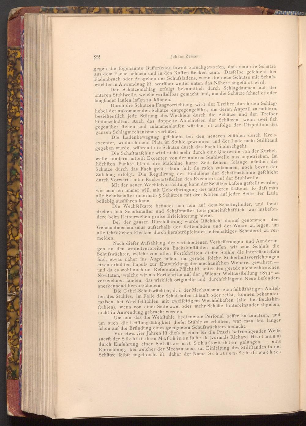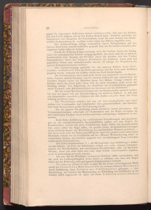 Nach diefer Aufzählung der verfchiedenen Verbefferungen und Aenderungen an den weiteftverbreiteten Buckskinftühlen müffen wir zum Schlufs die Schufswächter, welche von allen Fortfchritten diefer Stühle die intereffanteften find, etwas näher ins Auge faffen, da gerade folche Sicherheitsvorrichtungen einen erhöhten Impuls zur Entwicklung der mechanifchen Weberei gewähren und da es wohl auch des Referenten Pflicht ist, unter den gerade nicht zahlreichen Novitäten, welche wir als Fortfchritte auf der„ Wiener Weltausftellung 1873" zu verzeichnen fanden, das wirklich originelle und durchfchlagend Neue befonders anerkennend hervorzuheben.