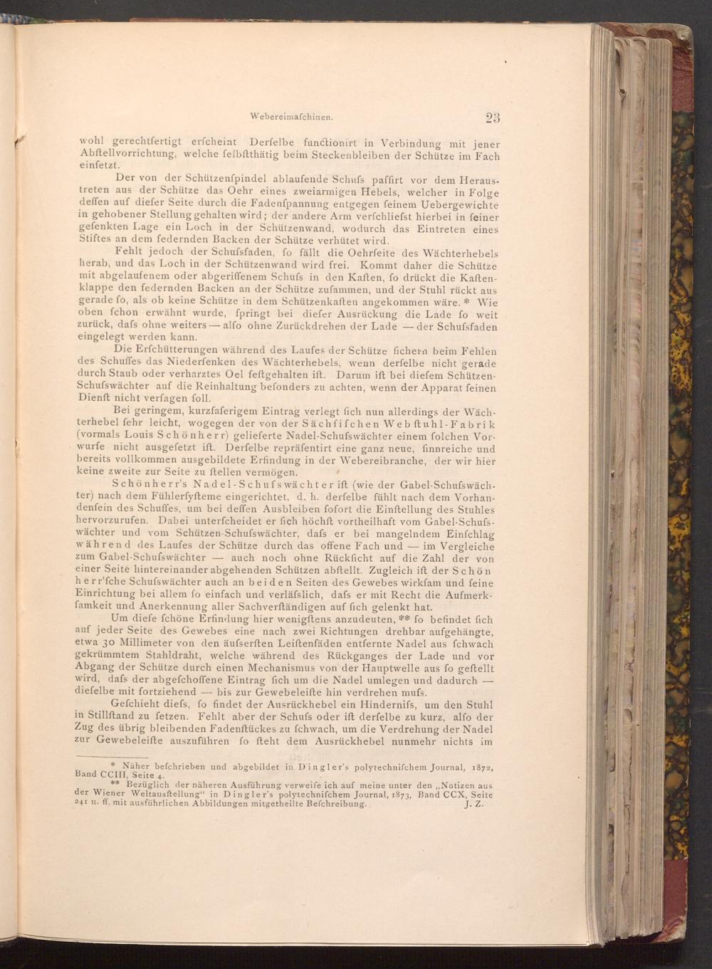 Um diefe fchöne Erfindung hier wenigftens anzudeuten,** fo befindet fich auf jeder Seite des Gewebes eine nach zwei Richtungen drehbar aufgehängte, etwa 30 Millimeter von den äufserften Leiftenfäden entfernte Nadel aus fchwach gekrümmtem Stahldraht, welche während des Rückganges der Lade und vor Abgang der Schütze durch einen Mechanismus von der Hauptwelle aus fo geftellt wird, dafs der abgefchoffene Eintrag fich um die Nadel umlegen und dadurch diefelbe mit fortziehend bis zur Gewebeleifte hin verdrehen muſs.