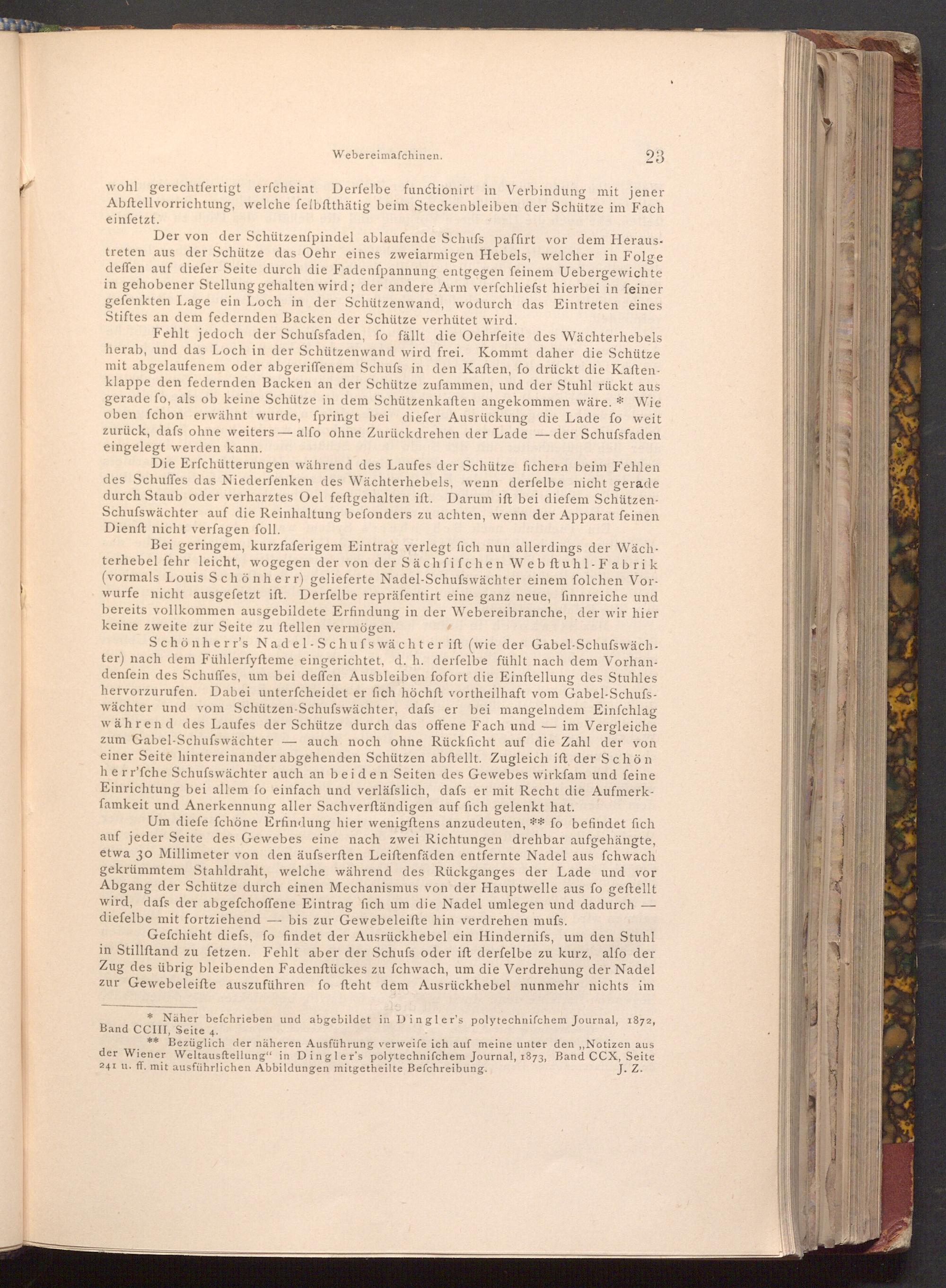 Schönherr's Nadel- Schufswächter ift( wie der Gabel- Schufswächter) nach dem Fühlerfyfteme eingerichtet, d. h. derfelbe fühlt nach dem Vorhandenfein des Schuffes, um bei deffen Ausbleiben fofort die Einftellung des Stuhles hervorzurufen. Dabei unterfcheidet er fich höchft vortheilhaft vom Gabel- Schufswächter und vom Schützen- Schufswächter, dafs er bei mangelndem Einfchlag während des Laufes der Schütze durch das offene Fach und im Vergleiche zum Gabel- Schufswächter auch noch ohne Rückficht auf die Zahl der von einer Seite hintereinander abgehenden Schützen abftellt. Zugleich ift der Schön herr'fche Schufswächter auch an beiden Seiten des Gewebes wirkfam und feine Einrichtung bei allem fo einfach und verläfslich, dafs er mit Recht die Aufmerkfamkeit und Anerkennung aller Sachverständigen auf fich gelenkt hat.