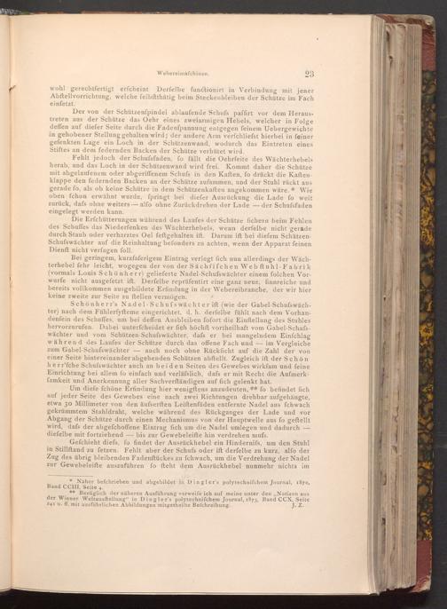 Fehlt jedoch der Schufsfaden, fo fällt die Oehrfeite des Wächterhebels herab, und das Loch in der Schützenwand wird frei. Kommt daher die Schütze mit abgelaufenem oder abgeriffenem Schufs in den Kaften, fo drückt die Kaftenklappe den federnden Backen an der Schütze zufammen, und der Stuhl rückt aus gerade fo, als ob keine Schütze in dem Schützenkaften angekommen wäre.* Wie oben fchon erwähnt wurde, fpringt bei diefer Ausrückung die Lade fo weit zurück, dafs ohne weiters- alfo ohne Zurückdrehen der Lade der Schufsfaden eingelegt werden kann.
