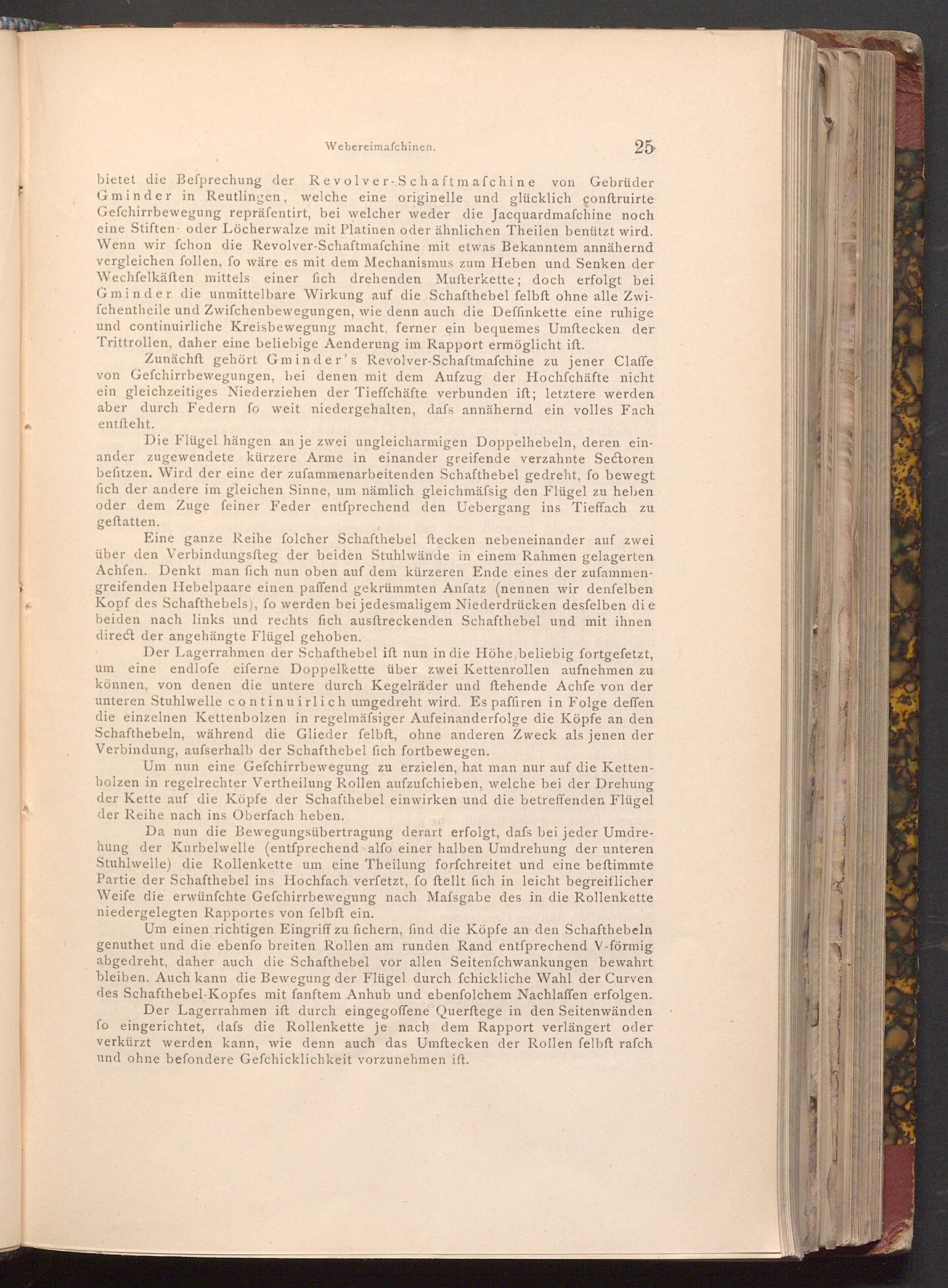 Zunächft gehört Gminder's Revolver- Schaftmafchine zu jener Claffe von Gefchirrbewegungen, bei denen mit dem Aufzug der Hochfchäfte nicht ein gleichzeitiges Niederziehen der Tieffchäfte verbunden ift; letztere werden aber durch Federn fo weit niedergehalten, dafs annähernd ein volles Fach entſteht.