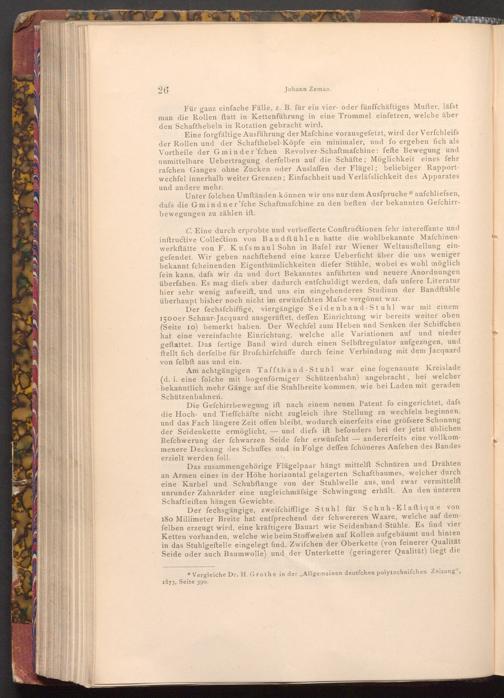 Der fechsfchiffige, viergängige Seidenband- Stuhl war mit einem 1500er Schnur- Jacquard ausgerüftet, deffen Einrichtung wir bereits weiter oben ( Seite 10) bemerkt haben. Der Wechfel zum Heben und Senken der Schiffchen hat eine vereinfachte Einrichtung, welche alle Variationen auf und nieder geftattet. Das fertige Band wird durch einen Selbftregulator aufgezogen, und ftellt fich derfelbe für Brofchirfchüffe durch feine Verbindung mit dem Jacquard von felbft aus und ein.
