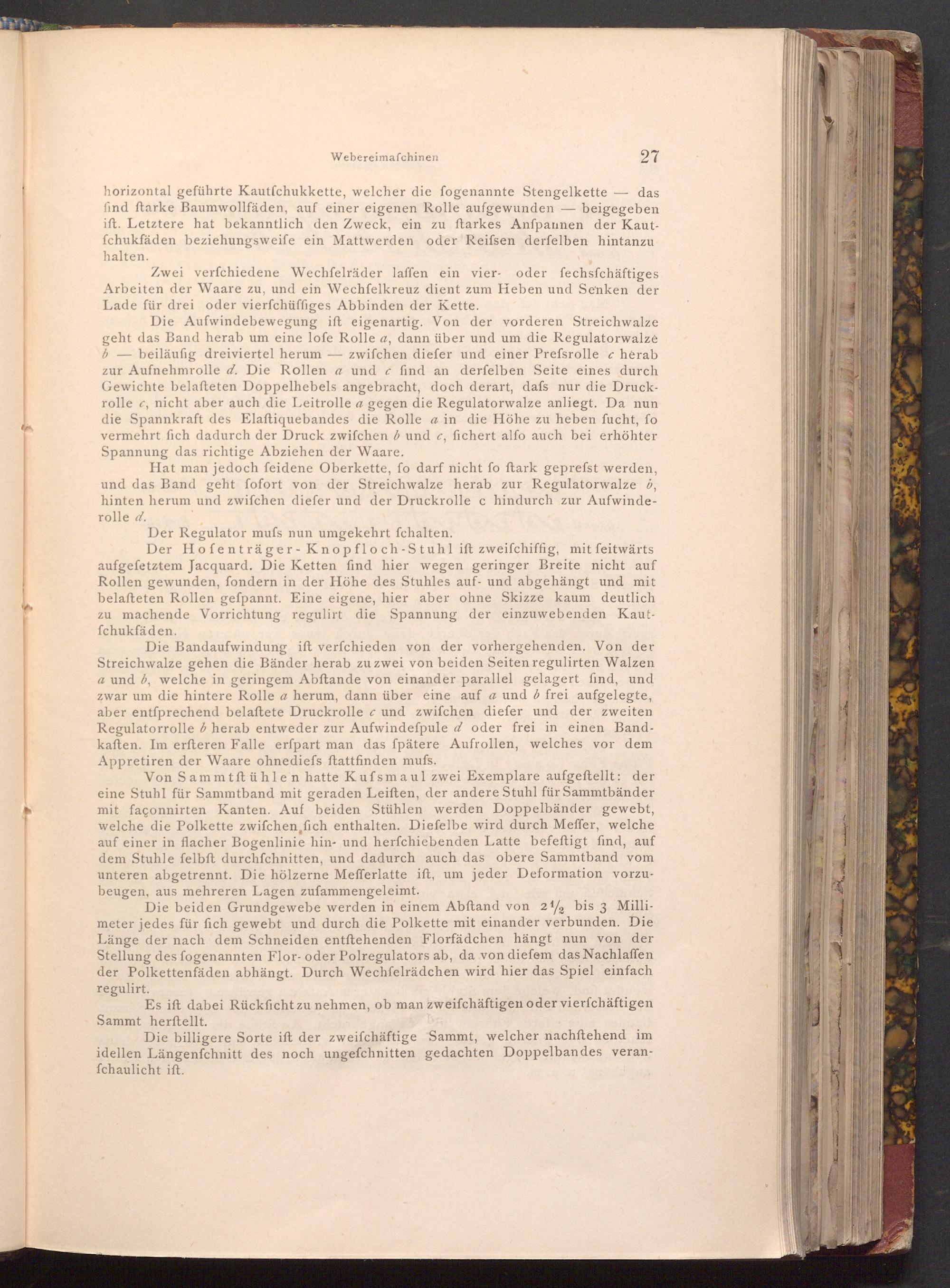 Der Hofenträger- Knopfloch- Stuhl ift zweifchiffig, mit feitwärts aufgefetztem Jacquard. Die Ketten find hier wegen geringer Breite nicht auf Rollen gewunden, fondern in der Höhe des Stuhles auf- und abgehängt und mit belafteten Rollen gefpannt. Eine eigene, hier aber ohne Skizze kaum deutlich zu machende Vorrichtung regulirt die Spannung der einzuwebenden Kautfchukfäden.