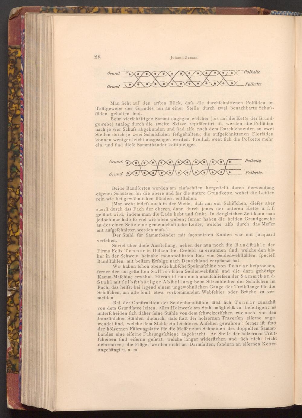 ( Man webt indefs auch in der Weife, dafs nur ein Schiffchen, diefes aber zuerft durch das Fach der oberen, dann durch jenes der unteren Kette u. f. f. geführt wird, indem man die Lade hebt und fenkt. In der gleichen Zeit kann man jedoch nur halb fo viel wie oben weben; ferner haben die beiden Grundgewebe an der einen Seite eine gemeinfchaftliche Leifte, welche alfo durch das Meffer mit aufgefchnitten werden mufs.)