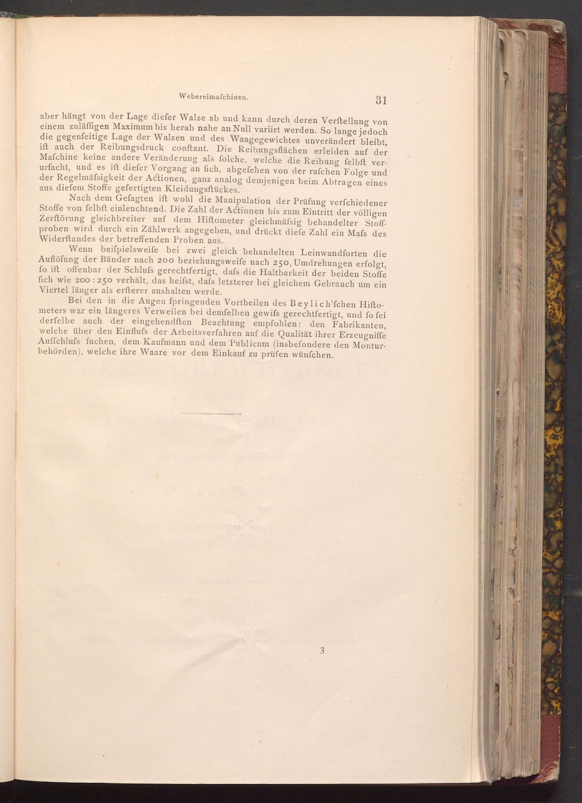 Bei den in die Augen fpringenden Vortheilen des Beylich'fchen Hiftometers war ein längeres Verweilen bei demfelben gewifs gerechtfertigt, und fo fei derfelbe auch der eingehendften Beachtung empfohlen: den Fabrikanten, welche über den Einfluss der Arbeitsverfahren auf die Qualität ihrer Erzeugniffe Auffchlufs fuchen, dem Kaufmann und dem Publicum( insbefondere den Monturbehörden), welche ihre Waare vor dem Einkauf zu prüfen wünſchen.
