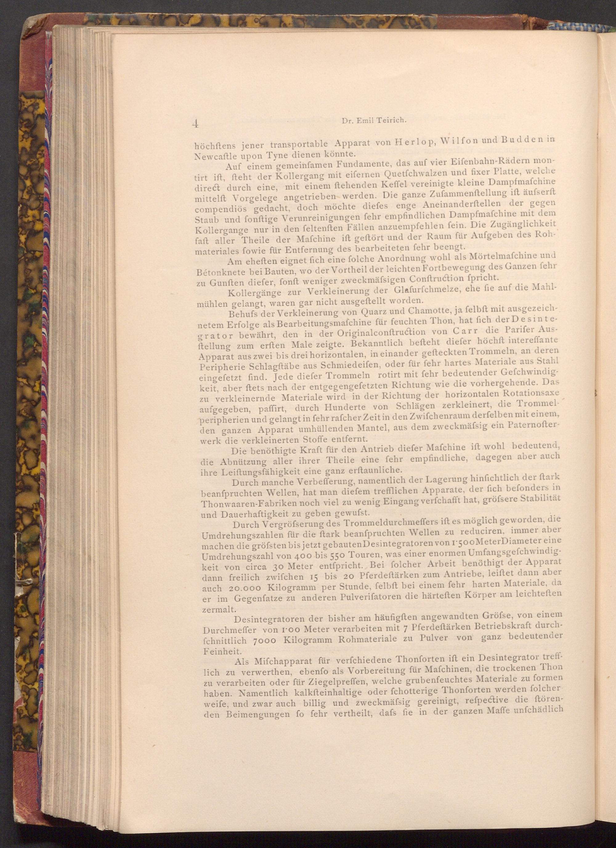 Als Mifchapparat für verfchiedene Thonforten ift ein Desintegrator trefflich zu verwerthen, ebenfo als Vorbereitung für Maſchinen, die trockenen Thon zu verarbeiten oder für Ziegelpreffen, welche grubenfeuchtes Materiale zu formen haben. Namentlich kalksteinhaltige oder fchotterige Thonforten werden folcher weife, und zwar auch billig und zweckmäfsig gereinigt, refpective die ftörenden Beimengungen fo fehr vertheilt, dafs fie in der ganzen Maffe unfchädlich