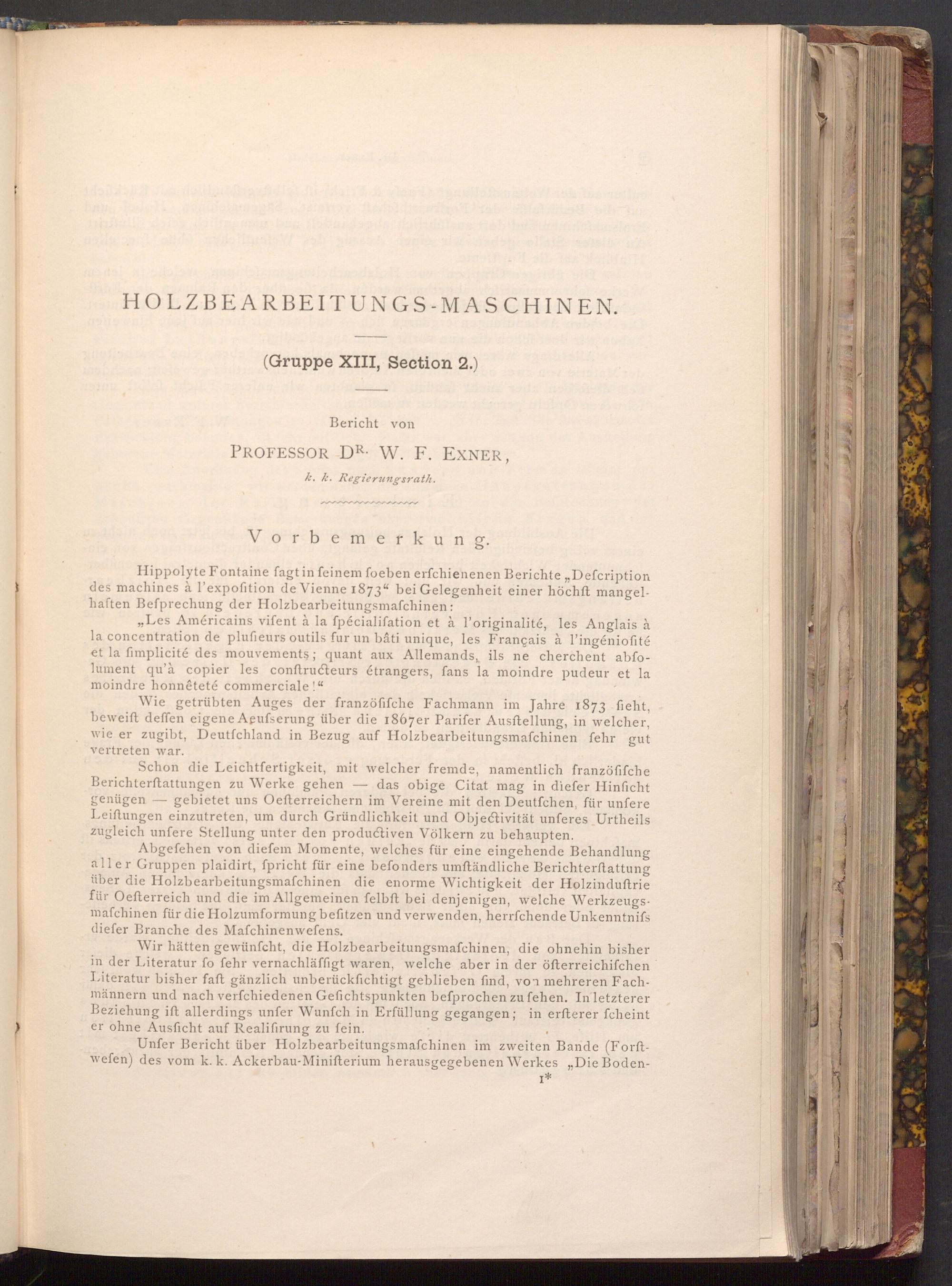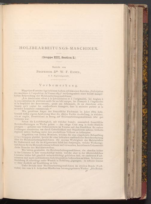 Abgefehen von diefem Momente, welches für eine eingehende Behandlung aller Gruppen plaidirt, fpricht für eine befonders umftändliche Berichterstattung über die Holzbearbeitungsmafchinen die enorme Wichtigkeit der Holzinduftrie für Oefterreich und die im Allgemeinen felbft bei denjenigen, welche Werkzeugsmafchinen für die Holzumformung befitzen und verwenden, herrfchende Unkenntnifs diefer Branche des Mafchinenwefens.