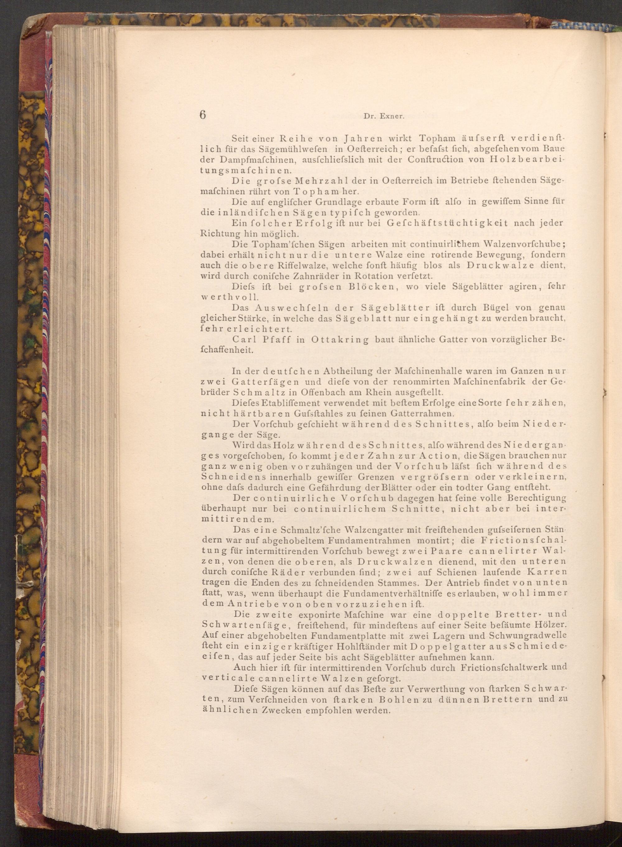 Seit einer Reihe von Jahren wirkt Topham äufserft verdienftlich für das Sägemühlwefen in Oefterreich; er befafst fich, abgefehen vom Baue der Dampfmaschinen, ausfchliefslich mit der Conftruction von Holzbearbeitungsmafchinen.