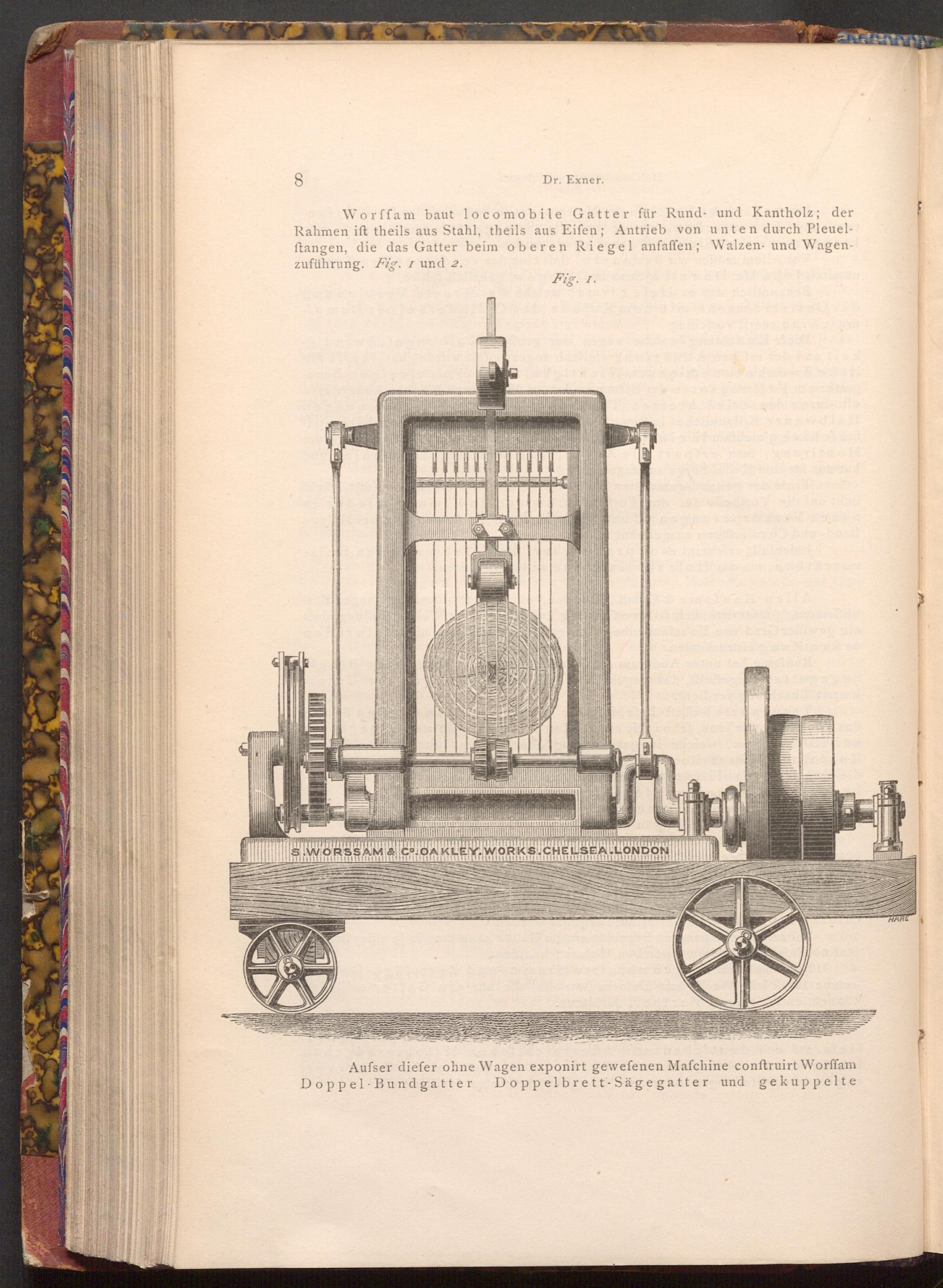 Aufser diefer ohne Wagen exponirt gewefenen Mafchine conftruirt Worffam Doppel Bundgatter Doppelbrett- Sägegatter und gekuppelte