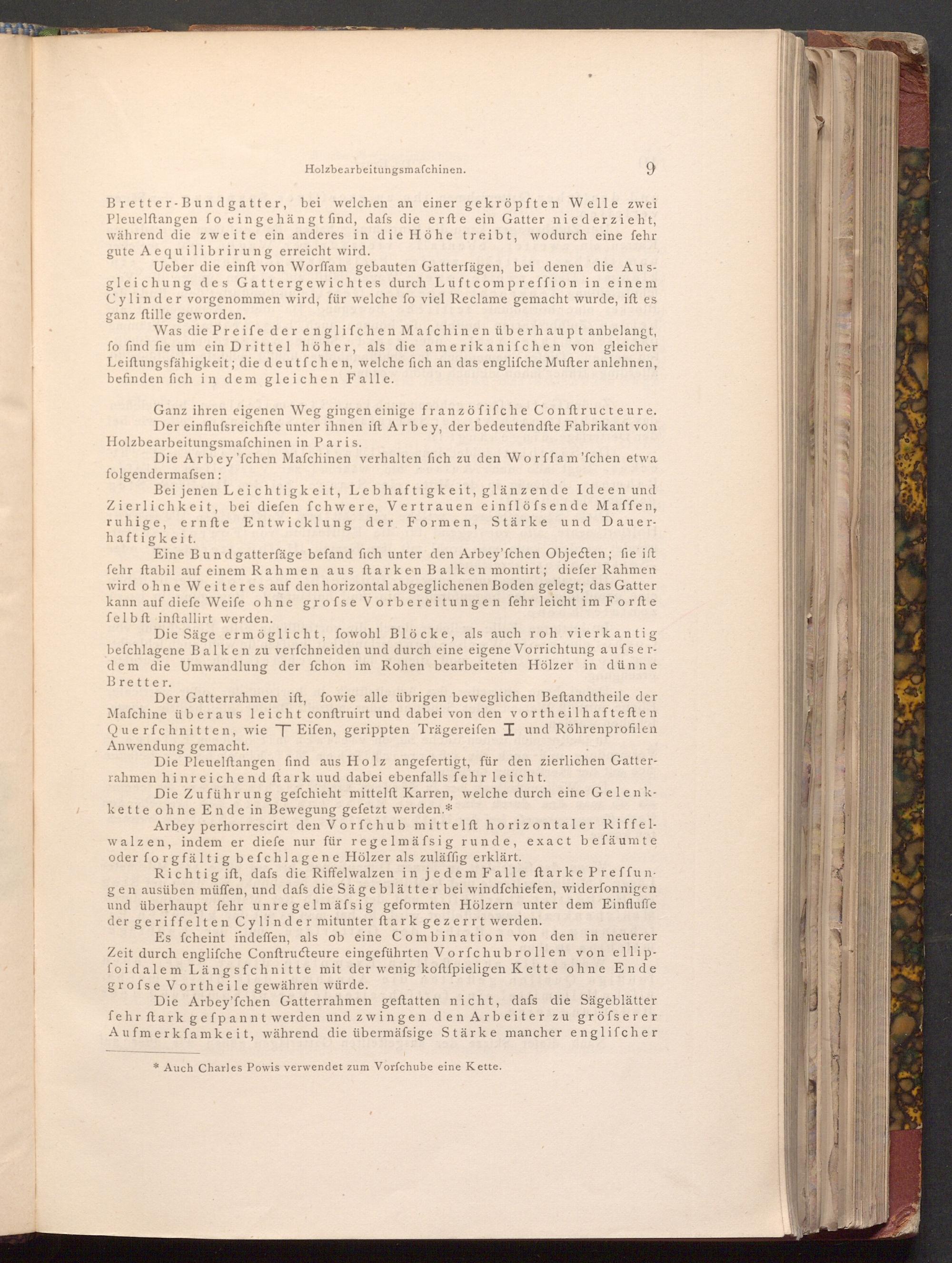 Arbey perhorrescirt den Vorfchub mittelft horizontaler Riffelwalzen, indem er diefe nur für regelmäfsig runde, exact befäumte oder forgfältig befchlagene Hölzer als zuläffig erklärt.