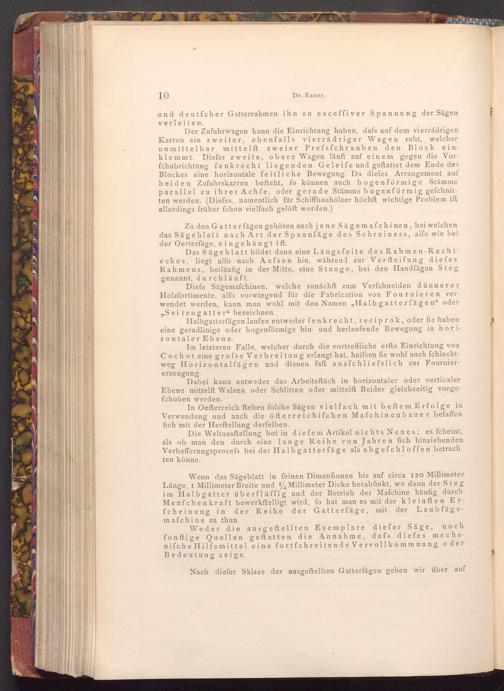 Zu den Gatter fägen gehören auch jene Sägemafchinen, bei welchen das Sägeblatt nach Art der Spannfäge des Schreiners, alfo wie bei der Oerterfäge, eingehängt ift.