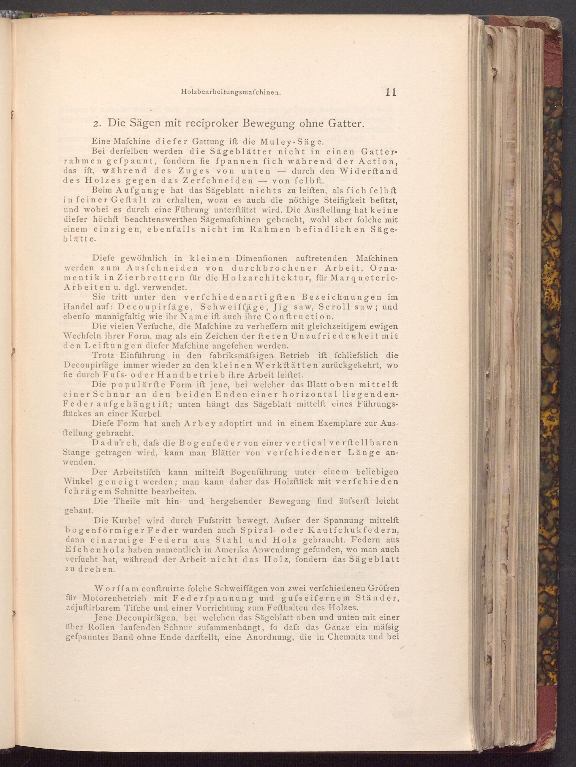 Diefe gewöhnlich in kleinen Dimenfionen auftretenden Mafchinen werden zum Ausfchneiden von durchbrochener Arbeit, Ornamentik in Zierbrettern für die Holzarchitektur, für MarqueterieArbeiten u. dgl. verwendet.