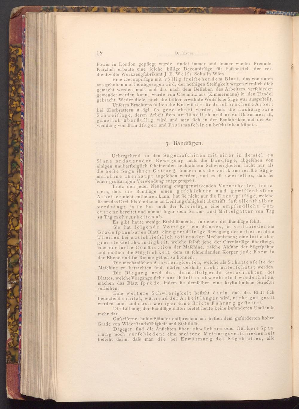 Es gibt heute wenige Etabliffements, in denen die Bandfäge fehlt. Sie hat folgende Vorzüge: ein dünnes, in verfchiedenem Gradefpannbares Blatt, eine geradlinige Bewegung des arbeitenden Theiles bei ausfchliefslich rotirenden Mechanismen; eine faft nnbegrenzte Gefchwindigkeit, welche felbft jene der Circularfäge überfteigt, eine einfache Conftruction der Mafchine, rafche Abfuhr der Sägefpähne und endlich die Möglichkeit, dem zu fchneidenden Körper je de Form in der Ebene und im Raume geben zu können.