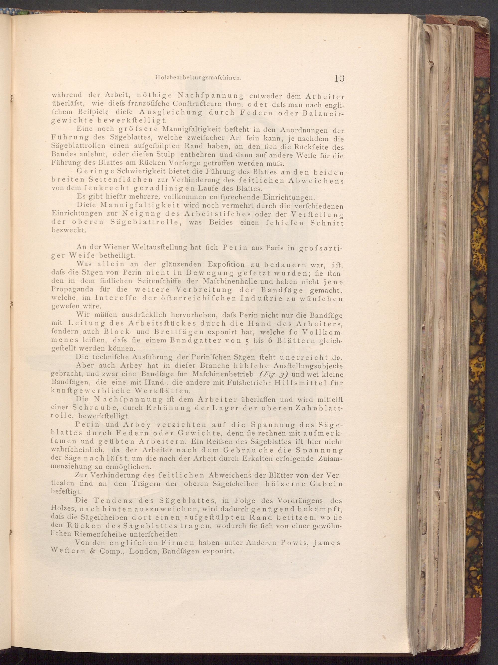 Was allein an der glänzenden Expofition zu bedauern war, iſt, dafs die Sägen von Perin nicht in Bewegung gefetzt wurden; fie ftanden in dem füdlichen Seitenfchiffe der Mafchinenhalle und haben nicht je ne Propaganda für die weitere Verbreitung der Bandfäge gemacht, welche im Intereffe der öfterreichifchen Induftrie zu wünfchen gewefen wäre.