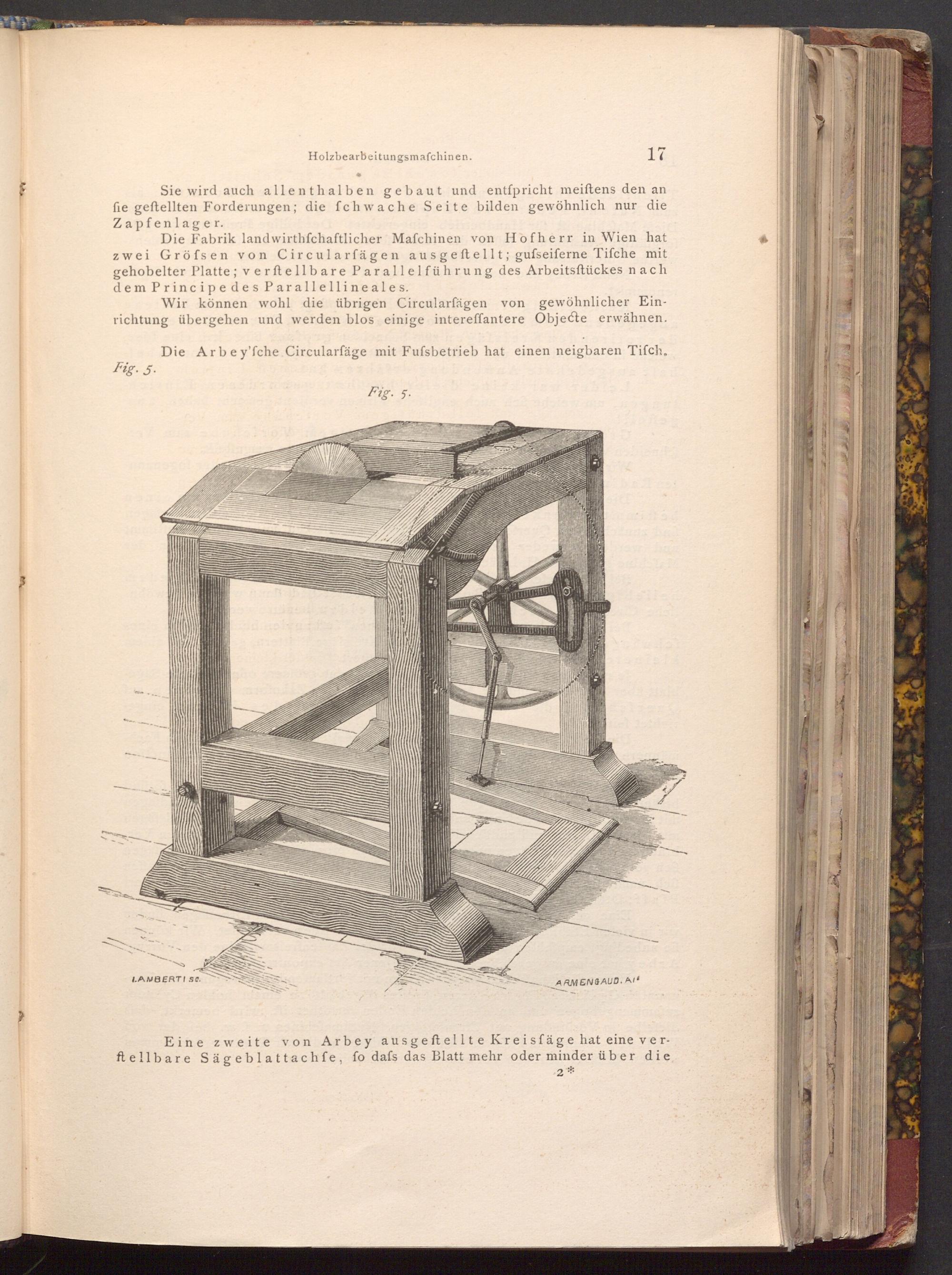 Wir können wohl die übrigen Circularfägen von gewöhnlicher Einrichtung übergehen und werden blos einige intereffantere Objecte erwähnen. Die Arbey'fche Circularfäge mit Fufsbetrieb hat einen neigbaren Tifch. Fig. 5.