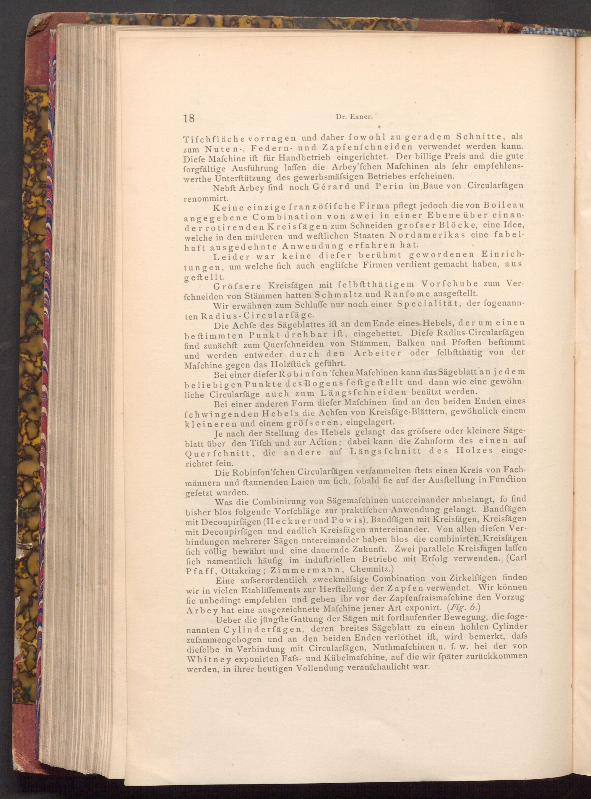 Ueber die jüngfte Gattung der Sägen mit fortlaufender Bewegung, die fogenannten Cylinderfägen, deren breites Sägeblatt zu einem hohlen Cylinder zufammengebogen und an den beiden Enden verlöthet ift, wird bemerkt, dafs diefelbe in Verbindung mit Circularfägen, Nuthmaſchinen u. f. w. bei der von Whitney exponirten Fafs- und Kübelmafchine, auf die wir fpäter zurückkommen werden, in ihrer heutigen Vollendung veranschaulicht war.