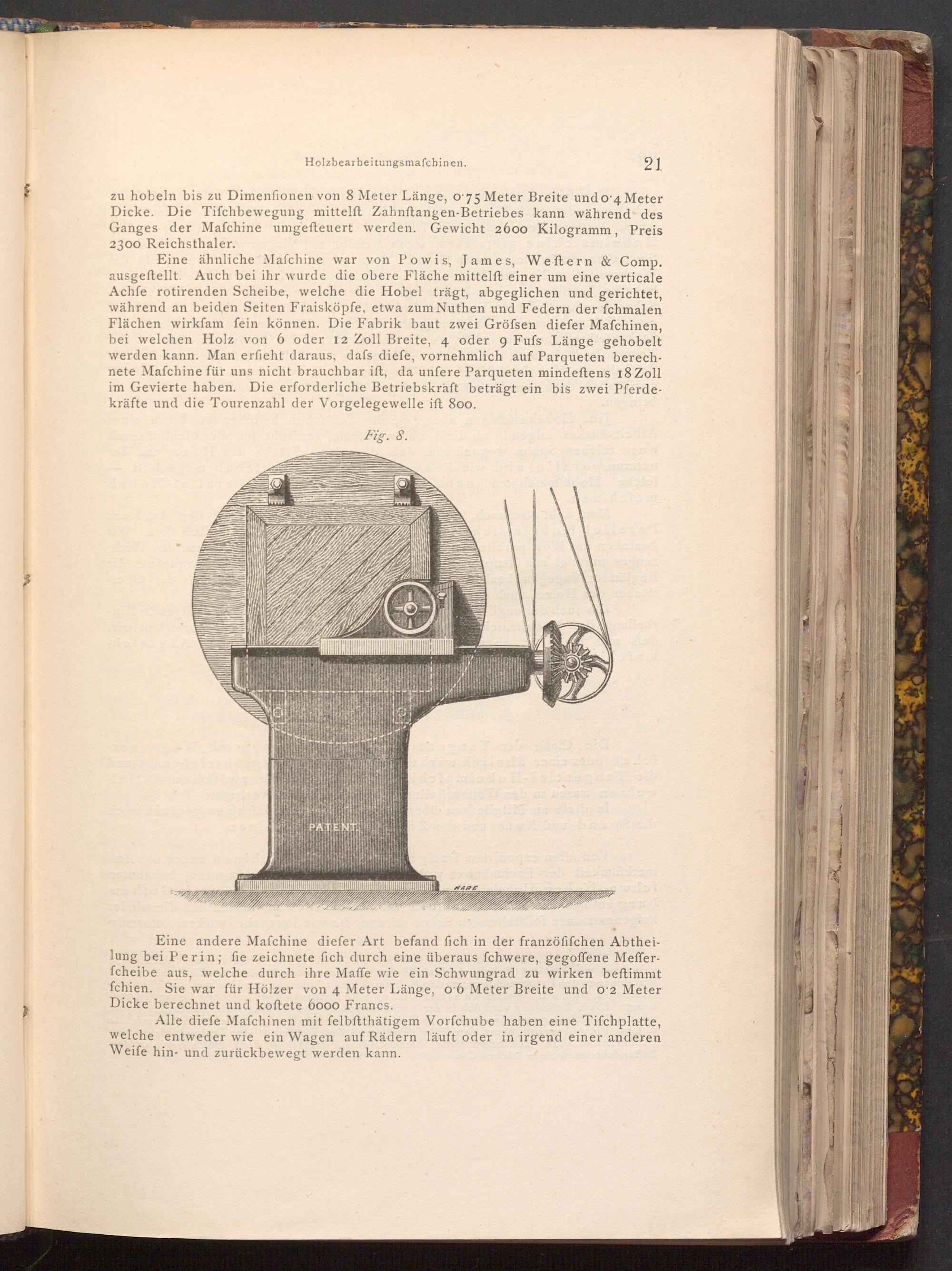 Eine andere Maſchine diefer Art befand fich in der franzöfifchen Abtheilung bei Perin; fie zeichnete fich durch eine überaus fchwere, gegoffene Mefferfcheibe aus, welche durch ihre Maffe wie ein Schwungrad zu wirken beftimmt fchien. Sie war für Hölzer von 4 Meter Länge, 06 Meter Breite und 0'2 Meter Dicke berechnet und koftete 6000 Francs.