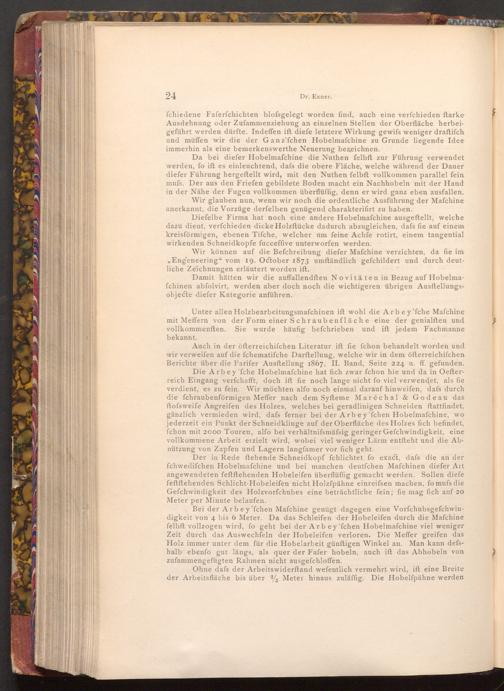 fchiedene Faferfchichten blofsgelegt worden find, auch eine verfchieden ſtarke Ausdehnung oder Zufammenziehung an einzelnen Stellen der Oberfläche herbeigeführt werden dürfte. Indeffen ift diefe letztere Wirkung gewifs weniger draftifch und müffen wir die der Ganz'fchen Hobelmafchine zu Grunde liegende Idee immerhin als eine bemerkenswerthe Neuerung bezeichnen.