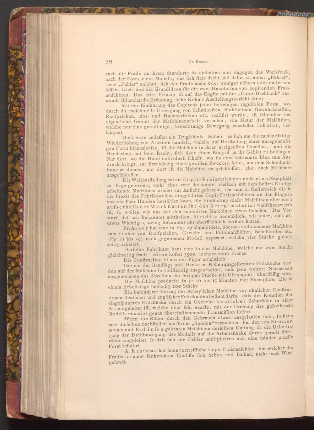 Die Weltausftellung hat an C opir- Fraismafchinen nicht eine Neuigkeit zu Tage gefördert, wohl aber zwei bekannte, vielfach mit dem beften Erfolge arbeitende Mafchinen wieder zur Anficht gebracht. Da man in Oefterreich die in die Praxis des Fabrikswefens eingeführten Copir- Fraismafchinen an den Fingern von ein Paar Händen herzählen kann, die Einführung diefer Mafchinen aber auch aufserhalb der Werkstätten für das Kriegsmaterial wünfchenswerth ift, fo wollen wir uns mit den exponirten Mafchinen etwas befaffen. Der Vorwurf, dafs wir Bekanntes mittheilen, ift nicht fo bedenklich, wie jener, dafs wir etwas Wichtiges, wenig Bekanntes nur oberflächlich berührt hätten.