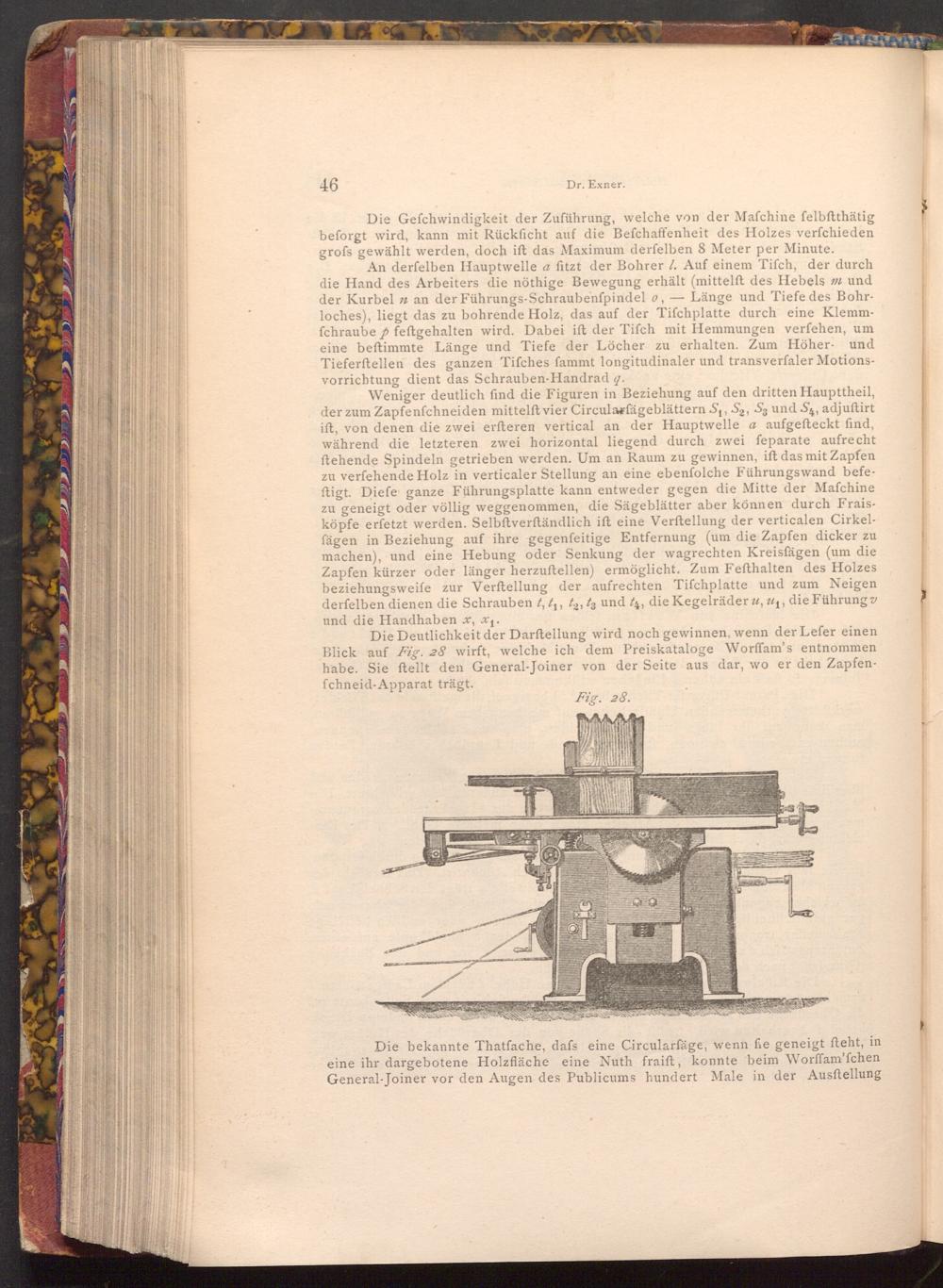 Die Deutlichkeit der Darstellung wird noch gewinnen, wenn der Lefer einen Blick auf Fig. 28 wirft, welche ich dem Preiskataloge Worffam's entnommen habe. Sie ftellt den General- Joiner von der Seite aus dar, wo er den Zapfenfchneid- Apparat trägt.