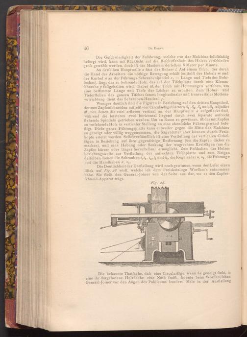 Die bekannte Thatfache, dafs eine Circularfäge, wenn fie geneigt fteht, in eine ihr dargebotene Holzfläche eine Nuth fraift, konnte beim Worffam'fchen General Joiner vor den Augen des Publicums hundert Male in der Ausftellung