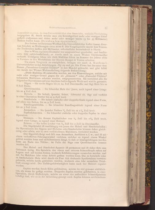 Das in Wien exponirte Exemplar war ausgezeichnet gearbeitet und functionirte fehr zufriedenftellend; es wurde auch an einen Wiener Tifchlermeifter verkauft. Uebrigens fahen wir diefe Mafchine fchon im Sommer des Jahres 1872 in Verviers in den Werkstätten der Herren Houget& Teston arbeiten.