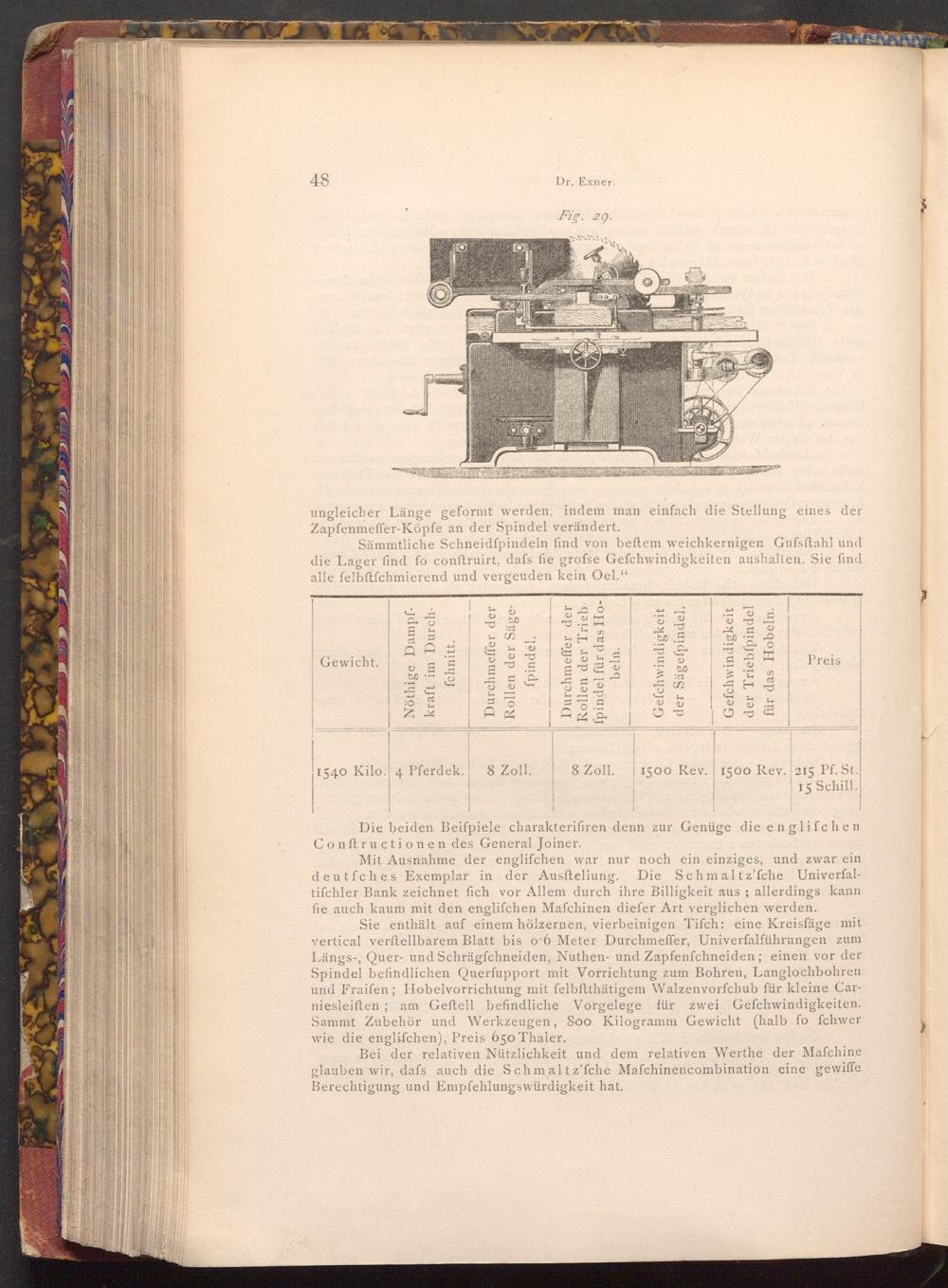 Sie enthält auf einem hölzernen, vierbeinigen Tifch: eine Kreisfäge mit vertical verftellbarem Blatt bis o 6 Meter Durchmeffer, Univerfalführungen zum Längs-, Quer- und Schrägfchneiden, Nuthen- und Zapfenfchneiden; einen vor der Spindel befindlichen Querfupport mit Vorrichtung zum Bohren, Langlochbohren und Fraifen; Hobelvorrichtung mit felbftthätigem Walzenvorfchub für kleine Carniesleiften; am Geftell befindliche Vorgelege für zwei Gefchwindigkeiten. Sammt Zubehör und Werkzeugen, 800 Kilogramm Gewicht( halb fo fchwer wie die englifchen), Preis 650 Thaler.