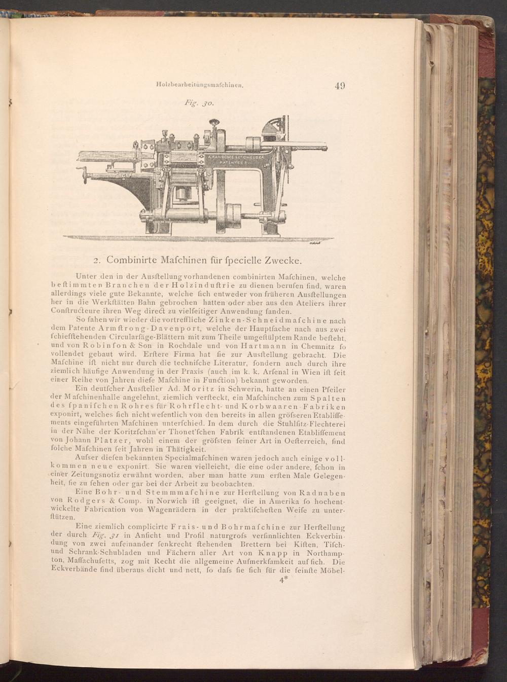 Ein deutfcher Ausfteller Ad. Moritz in Schwerin, hatte an einen Pfeiler der M afchinenhalle angelehnt, ziemlich verfteckt, ein Mafchinchen zum Spalten des fpanifchen Rohres für Rohrflecht- und Korbwaaren Fabriken exponirt, welches fich nicht wefentlich von den bereits in allen gröfseren Etabliffements eingeführten Maſchinen unterfchied. In dem durch die Stuhlfitz- Flechterei in der Nähe der Koritzfchan'er Thonet'fchen Fabrik entstandenen Etabliffement von Johann Platzer, wohl einem der gröfsten feiner Art in Oefterreich, find folche Mafchinen feit Jahren in Thätigkeit.