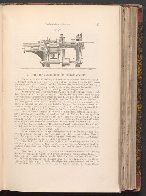 So fahen wir wieder die vortreffliche Zinken- Schneidmafchine nach dem Patente Armstrong Davenport, welche der Hauptfache nach aus zwei fchiefftehenden Circularfäge- Blättern mit zum Theile umgeftülptem Rande befteht, und von Robinfon& Son in Rochdale und von Hartmann in Chemnitz fo vollendet gebaut wird. Erftere Firma hat fie zur Ausftellung gebracht. Die Mafchine ift nicht nur durch die technifche Literatur, fondern auch durch ihre ziemlich häufige Anwendung in der Praxis( auch im k. k. Arfenal in Wien ift feit einer Reihe von Jahren diefe Mafchine in Function) bekannt geworden.
