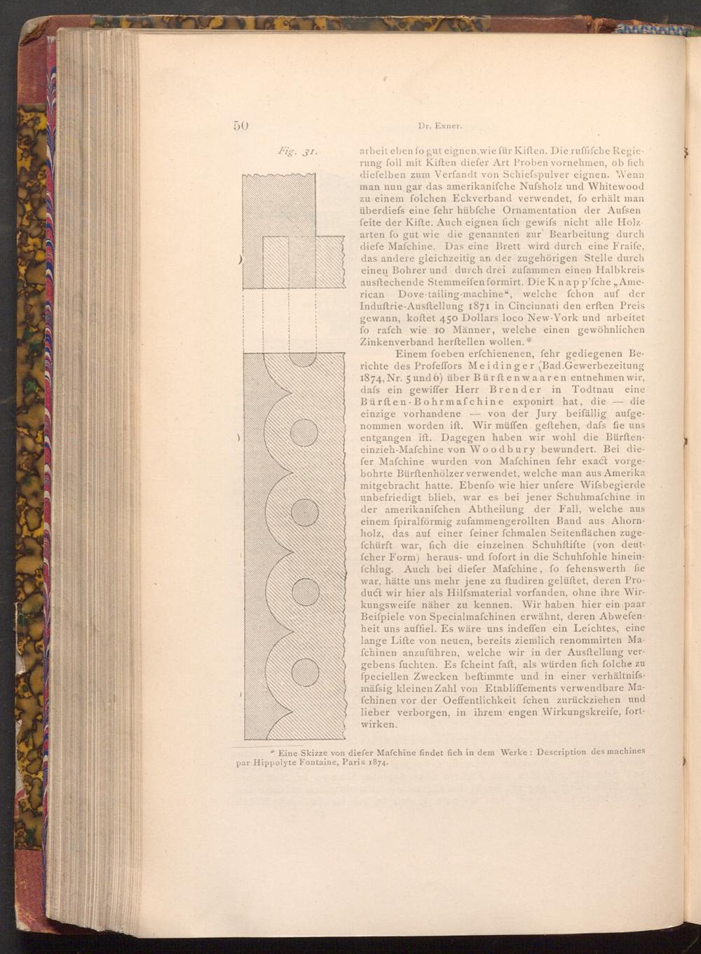 arbeit eben fo gut eignen, wie für Kiften. Die ruffifche Regierung foll mit Kiften diefer Art Proben vornehmen, ob fich diefelben zum Verfandt von Schiefspulver eignen. Wenn man nun gar das amerikanifche Nufsholz und Whitewood zu einem folchen Eckverband verwendet, fo erhält man überdiefs eine fehr hübfche Ornamentation der Aufsen feite der Kifte. Auch eignen fich gewifs nicht alle Holzarten fo gut wie die genannten zur Bearbeitung durch diefe Mafchine. Das eine Brett wird durch eine Fraife, das andere gleichzeitig an der zugehörigen Stelle durch einen Bohrer und durch drei zufammen einen Halbkreis ausftechende Stemmeifen formirt. Die Knapp'fche ,, AmeDove- tailing- machine", welche fchon auf der Induftrie- Ausftellung 1871 in Cincinnati den erften Preis gewann, koftet 450 Dollars loco New- York und arbeitet fo rafch wie 10 Männer, welche einen gewöhnlichen Zinkenverband herftellen wollen.*