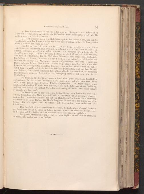 Die Dauben haben convergirende Seitenflächen, von denen die eine eine Feder, die andere eine Nuth angefraift erhält. Die Dauben find alfo untereinander verfpundet. Ueberdiefs enthält der Set von Mafchinen- Fraifen für die Abrundung der Dauben an ihren Enden, für Herftellung des Bodens und zur Einfügung des felben Vorrichtungen zum Abputzen mit Glaspapier, zum Aufziehen der Reifen etc.