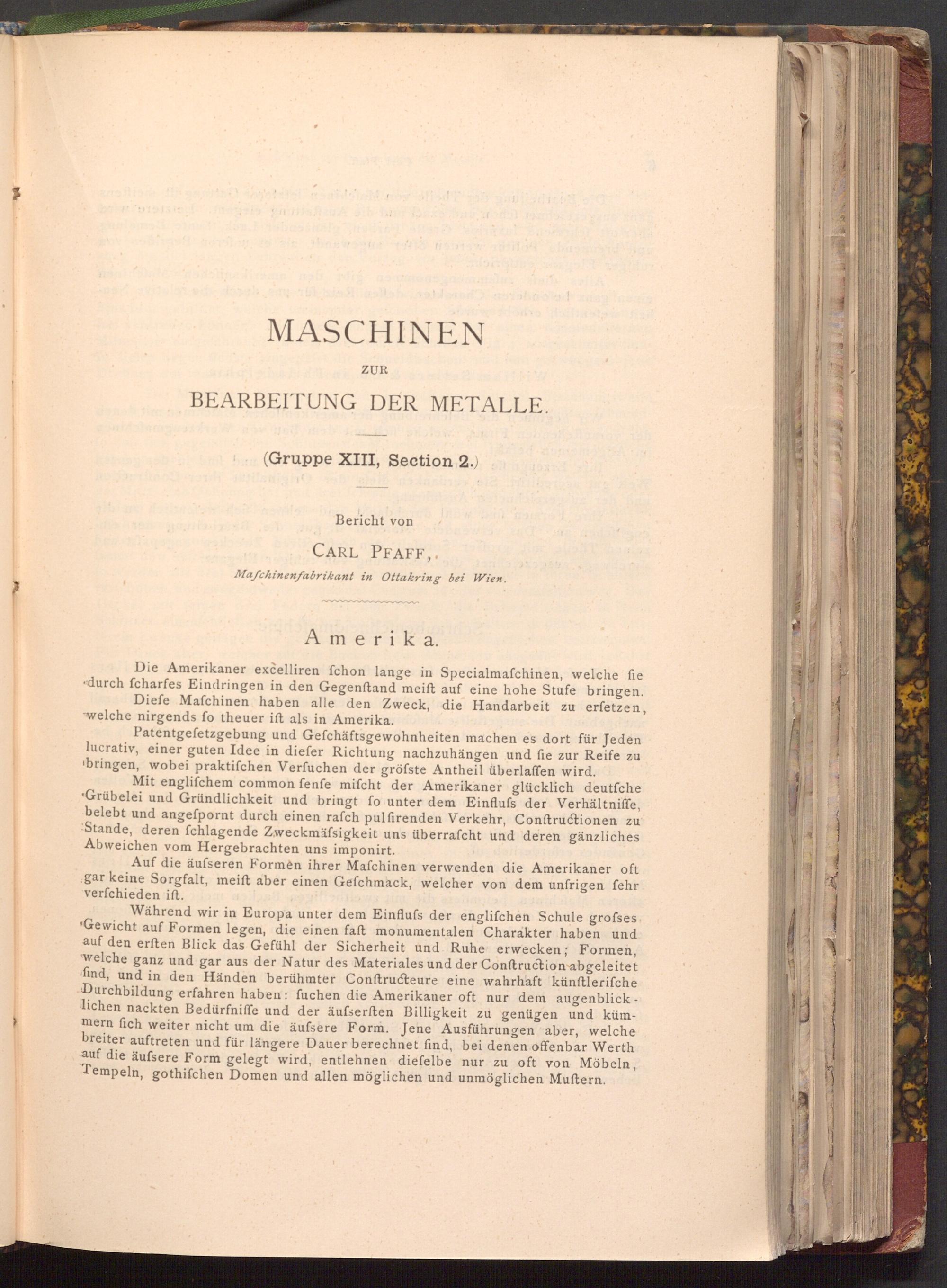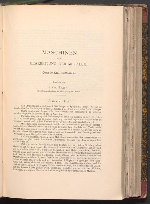 Die Amerikaner excelliren fchon lange in Specialmafchinen, welche fie durch fcharfes Eindringen in den Gegenftand meift auf eine hohe Stufe bringen. Diefe Maſchinen haben alle den Zweck, die Handarbeit zu erfetzen, welche nirgends fo theuer ift als in Amerika.