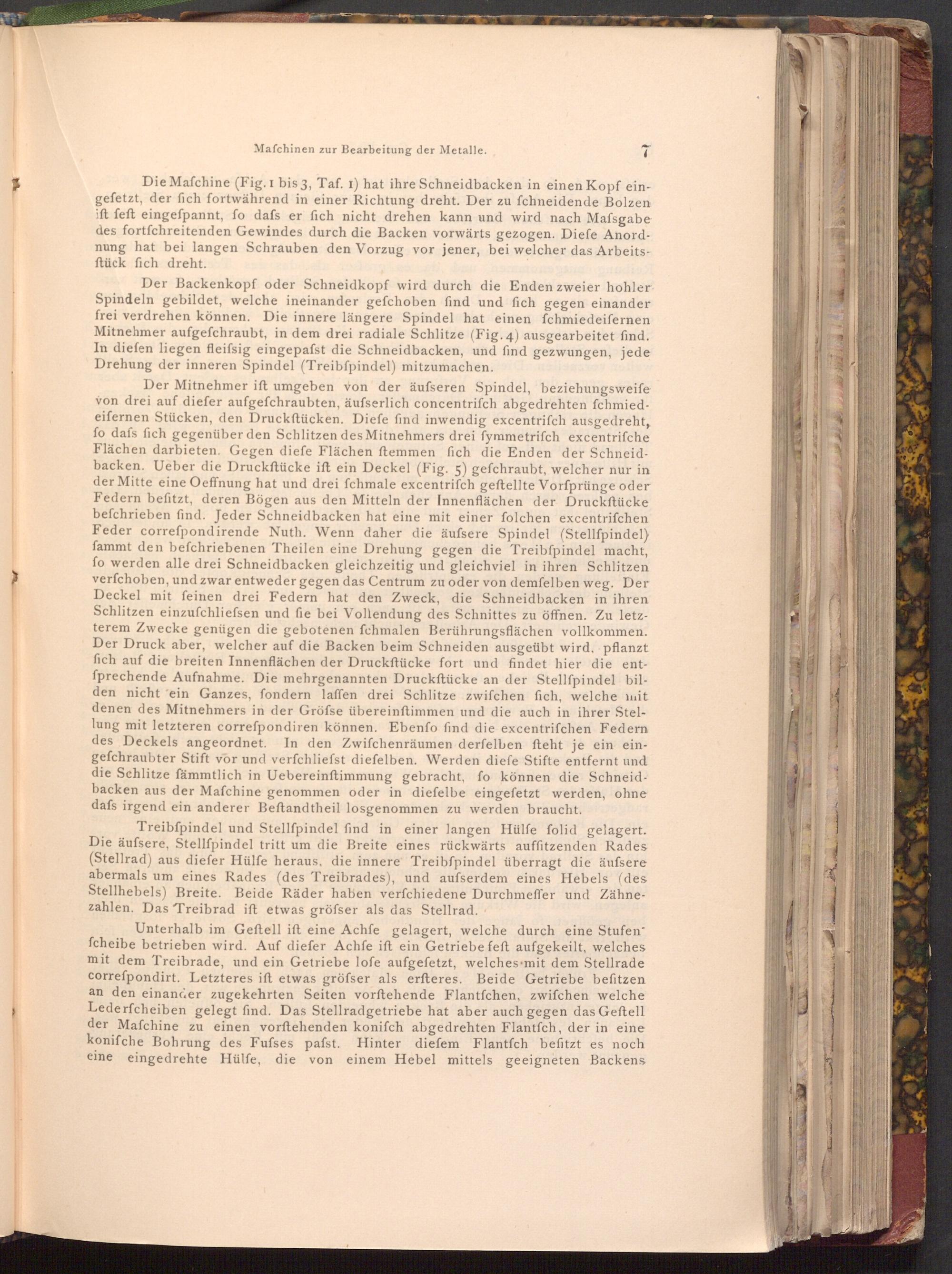 Die Mafchine( Fig. 1 bis 3, Taf. 1) hat ihre Schneidbacken in einen Kopf eingefetzt, der fich fortwährend in einer Richtung dreht. Der zu fchneidende Bolzen ift feft eingefpannt, fo dafs er fich nicht drehen kann und wird nach Mafsgabe des fortfchreitenden Gewindes durch die Backen vorwärts gezogen. Diefe Anordnung hat bei langen Schrauben den Vorzug vor jener, bei welcher das Arbeitsftück fich dreht.