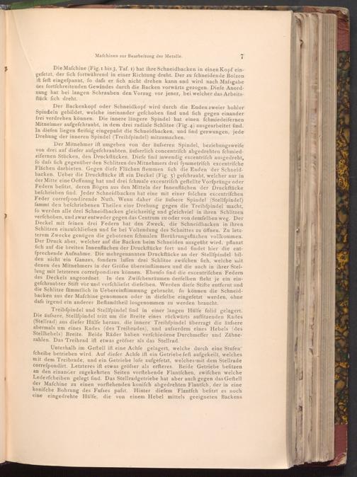 Der Mitnehmer ift umgeben von der äufseren Spindel, beziehungsweife von drei auf diefer aufgefchraubten, äufserlich concentrifch abgedrehten fchmiedeifernen Stücken, den Druckftücken. Diefe find inwendig excentrifch ausgedreht, fo dafs fich gegenüber den Schlitzen des Mitnehmers drei fymmetriſch excentrifche Flächen darbieten. Gegen diefe Flächen ftemmen fich die Enden der Schneidbacken. Ueber die Druckftücke ift ein Deckel( Fig. 5) gefchraubt, welcher nur in der Mitte eine Oeffnung hat und drei fchmale excentrifch geftellte Vorfprünge oder Federn befitzt, deren Bögen aus den Mitteln der Innenflächen der Druckftücke befchrieben find. Jeder Schneidbacken hat eine mit einer folchen excentrifchen Feder correfpondirende Nuth. Wenn daher die äufsere Spindel( Stellfpindel) fammt den befchriebenen Theilen eine Drehung gegen die Treibfpindel macht, fo werden alle drei Schneidbacken gleichzeitig und gleichviel in ihren Schlitzen verfchoben, und zwar entweder gegen das Centrum zu oder von demfelben weg. Der Deckel mit feinen drei Federn hat den Zweck, die Schneidbacken in ihren Schlitzen einzufchliefsen und fie bei Vollendung des Schnittes zu öffnen. Zu letzterem Zwecke genügen die gebotenen fchmalen Berührungsflächen vollkommen. Der Druck aber, welcher auf die Backen beim Schneiden ausgeübt wird, pflanzt fich auf die breiten Innenflächen der Druckftücke fort und findet hier die entfprechende Aufnahme. Die mehrgenannten Druckftücke an der Stellfpindel bilden nicht ein Ganzes, fondern laffen drei Schlitze zwifchen fich, welche mit denen des Mitnehmers in der Gröfse übereinftimmen und die auch in ihrer Stellung mit letzteren correfpondiren können. Ebenfo find die excentrifchen Federn des Deckels angeordnet. In den Zwifchenräumen derfelben fteht je ein eingefchraubter Stift vor und verfchliefst diefelben. Werden diefe Stifte entfernt und die Schlitze fämmtlich in Uebereinstimmung gebracht, fo können die Schneidbacken aus der Mafchine genommen oder in diefelbe eingefetzt werden, ohne dafs irgend ein anderer Beftandtheil losgenommen zu werden braucht.