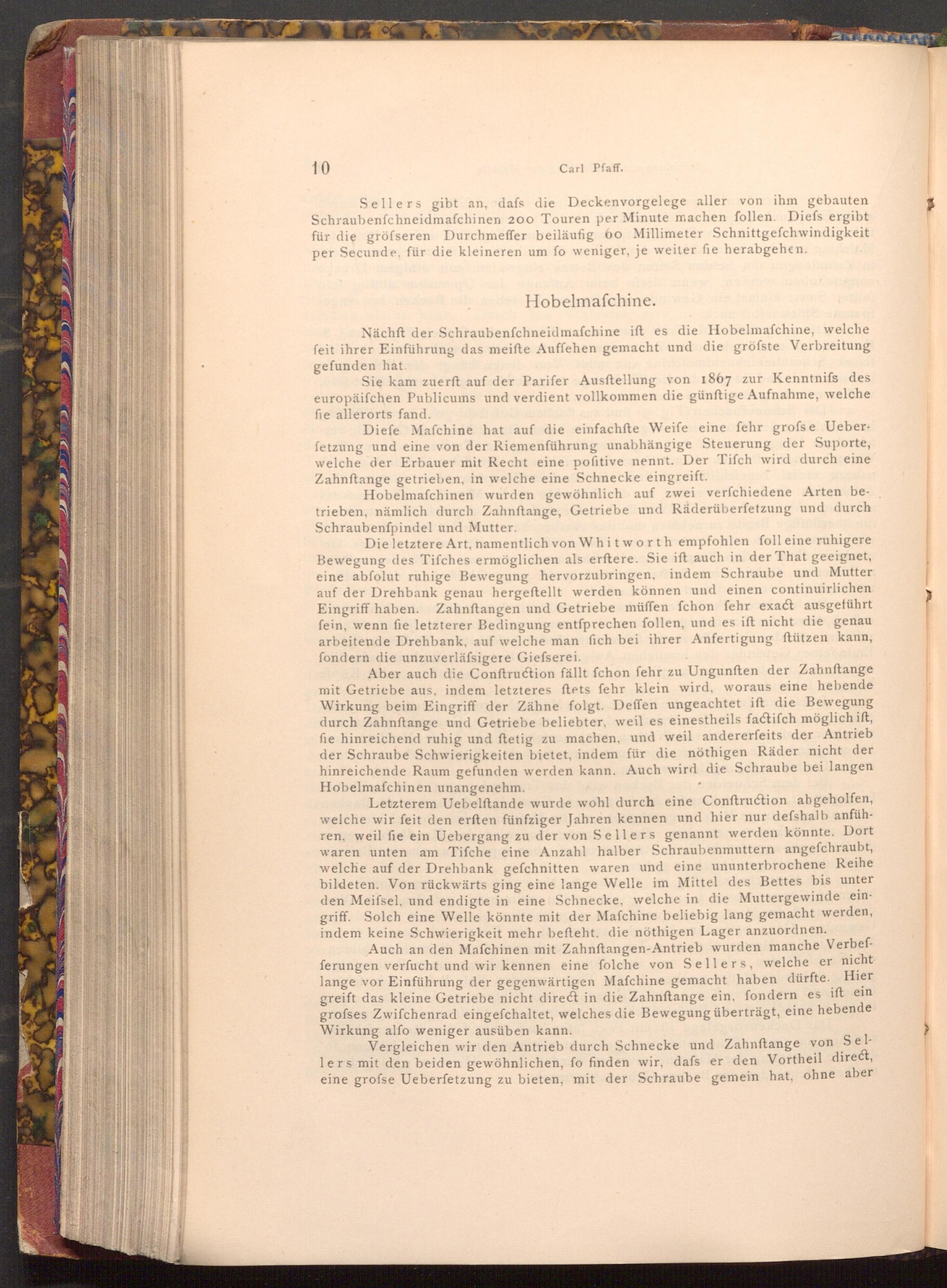 Letzterem Uebelftande wurde wohl durch eine Conftruction abgeholfen, welche wir feit den erften fünfziger Jahren kennen und hier nur defshalb anführen, weil fie ein Uebergang zu der von Sellers genannt werden könnte. Dort waren unten am Tifche eine Anzahl halber Schraubenmuttern angefchraubt, welche auf der Drehbank gefchnitten waren und eine ununterbrochene Reihe bildeten. Von rückwärts ging eine lange Welle im Mittel des Bettes bis unter den Meifsel, und endigte in eine Schnecke, welche in die Muttergewinde eingriff. Solch eine Welle könnte mit der Mafchine beliebig lang gemacht werden, indem keine Schwierigkeit mehr befteht, die nöthigen Lager anzuordnen.
