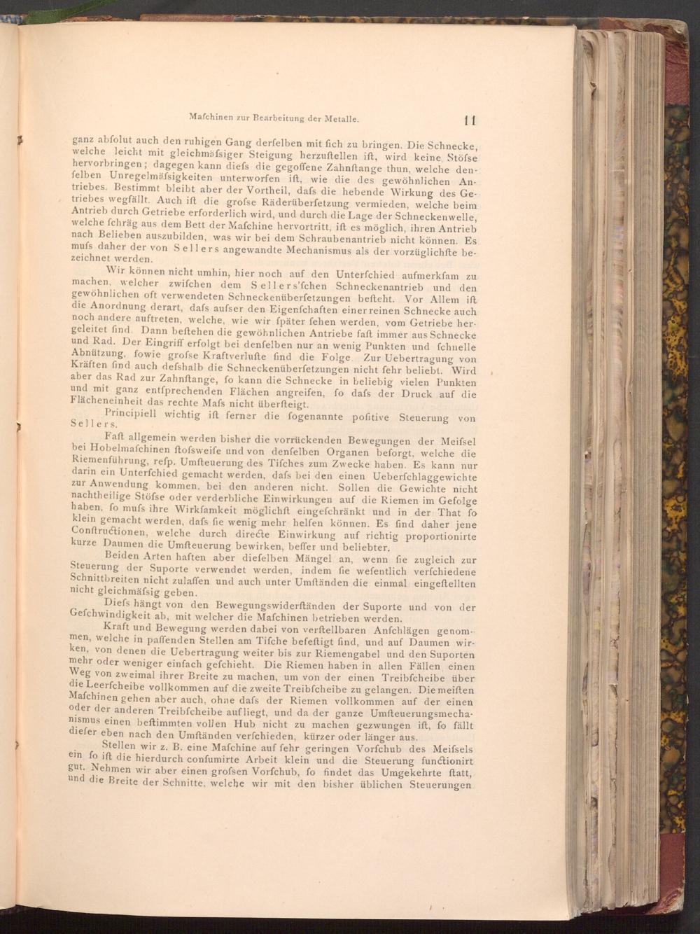 ganz abfolut auch den ruhigen Gang derfelben mit fich zu bringen. Die Schnecke, welche leicht mit gleichmäfsiger Steigung herzuftellen ift, wird keine, Stöfse hervorbringen; dagegen kann diefs die gegoffene Zahnftange thun, welche denfelben Unregelmässigkeiten unterworfen ift, wie die des gewöhnlichen Antriebes. Bestimmt bleibt aber der Vortheil, dafs die hebende Wirkung des Getriebes wegfällt. Auch ift die grofse Räderüberfetzung vermieden, welche beim Antrieb durch Getriebe erforderlich wird, und durch die Lage der Schneckenwelle, welche fchräg aus dem Bett der Mafchine hervortritt, ift es möglich, ihren Antrieb nach Belieben auszubilden, was wir bei dem Schraubenantrieb nicht können. Es mufs daher der von Sellers angewandte Mechanismus als der vorzüglichfte bezeichnet werden.