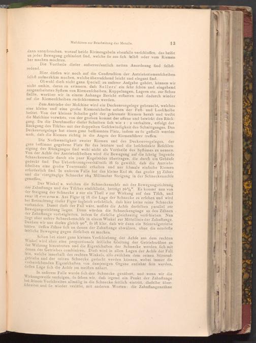 Der Winkel, welchen die Schneckenachfe mit der Bewegungsrichtung der Zahnftange und des Tifches einfchliefst, beträgt 262°. Es kommt nun von der Steigung der Schnecke s nur ein Theil e zur Wirkung auf den Tifch, und zwar ift es cos a. Aus Figur 15 ift die Lage der Schnecke zu erfehen und wird bei Betrachtung diefer Figur fogleich erfichtlich, dafs hier keine reine Schnecke vorhanden. Damit diefs der Fall wäre, müfste die Achfe derfelben parallel znr Bewegungsrichtung liegen. Dann würden die Schneckengänge an den Zähnen der Zahnftange vorbeigleiten, indem fie diefelbe gleichzeitig verfchieben. Nun liegt aber unfere Schneckenachfe in einem Winkel zur Mittellinie der Zahnftange. Denken wir uns diefen gleich 90°, fo ift klar, dafs wir dann ein Stirnradgetriebe hätten, deffen Zähne fich an denen der Zahnftange abwälzen, ohne die mindeſte feitliche Bewegung gegen diefelben zu machen.