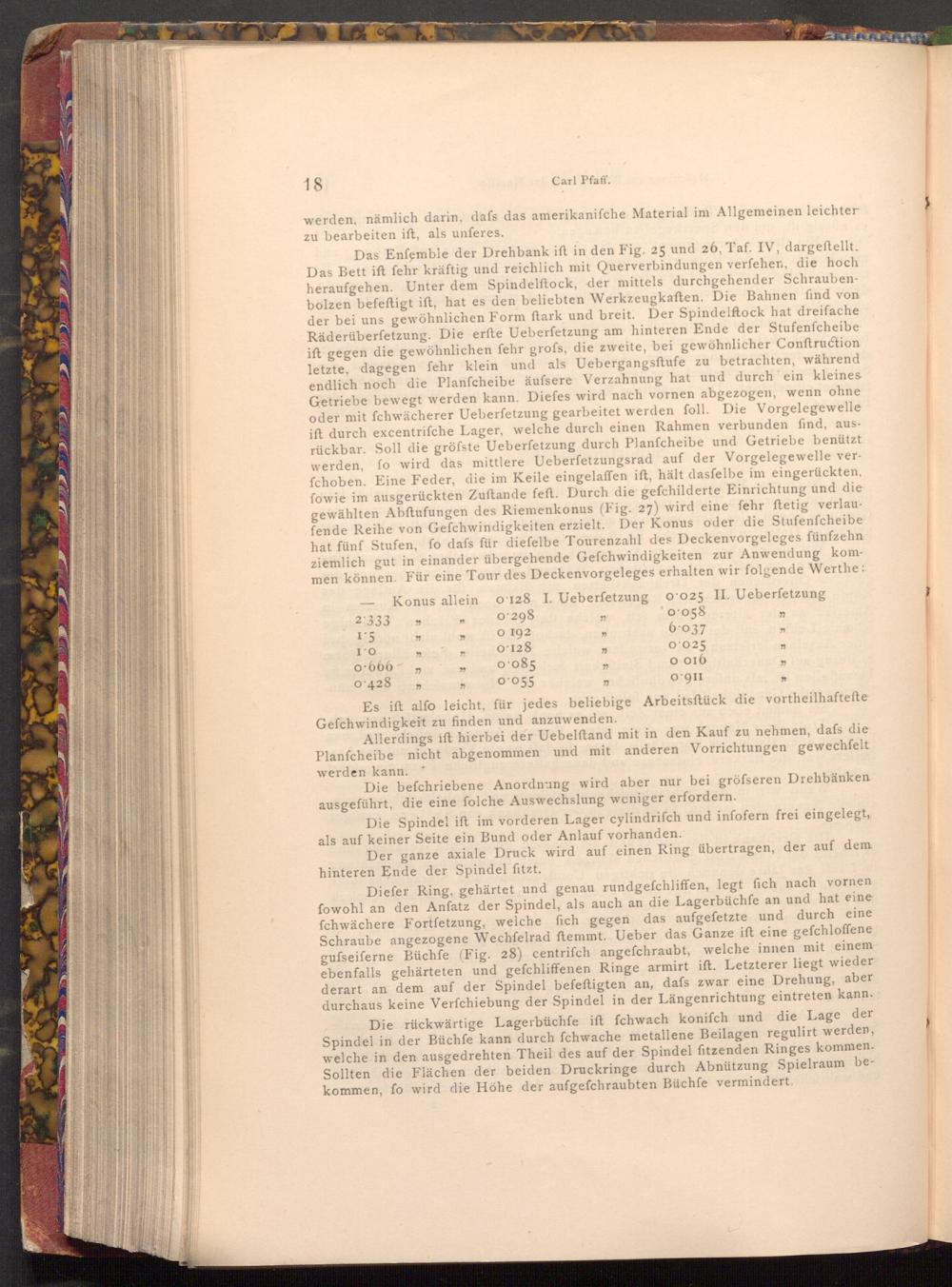 Das Enſemble der Drehbank ift in den Fig. 25 und 26, Taf. IV, dargestellt. Das Bett ift fehr kräftig und reichlich mit Querverbindungen verfehen, die hoch. heraufgehen. Unter dem Spindelftock, der mittels durchgehender Schraubenbolzen befeftigt ist, hat es den beliebten Werkzeugkaften. Die Bahnen find von der bei uns gewöhnlichen Form ftark und breit. Der Spindelftock hat dreifache Räderüberfetzung. Die erfte Ueberfetzung am hinteren Ende der Stufenfcheibe ift gegen die gewöhnlichen fehr grofs, die zweite, bei gewöhnlicher Conftruction letzte, dagegen fehr klein und als Uebergangsftufe zu betrachten, während endlich noch die Planfcheibe äufsere Verzahnung hat und durch ein kleines Getriebe bewegt werden kann. Diefes wird nach vornen abgezogen, wenn ohne oder mit fchwächerer Ueberfetzung gearbeitet werden foll. Die Vorgelegewelle ift durch excentrifche Lager, welche durch einen Rahmen verbunden find, ausrückbar. Soll die gröfste Ueberfetzung durch Planfcheibe und Getriebe benützt werden, fo wird das mittlere Ueberfetzungsrad auf der Vorgelegewelle verfchoben. Eine Feder, die im Keile eingelaffen ift, hält dasfelbe im eingerückten, fowie im ausgerückten Zuftande feft. Durch die gefchilderte Einrichtung und die gewählten Abftufungen des Riemenkonus( Fig. 27) wird eine fehr ftetig verlaufende Reihe von Gefchwindigkeiten erzielt. Der Konus oder die Stufenfcheibe hat fünf Stufen, fo dafs für diefelbe Tourenzahl des Deckenvorgeleges fünfzehn ziemlich gut in einander übergehende Gefchwindigkeiten zur Anwendung kommen können. Für eine Tour des Deckenvorgeleges erhalten wir folgende Werthe: Konus allein 0.128 I. Ueberfetzung 0128 I. Ueberfetzung 0.025 II. Ueberfetzung