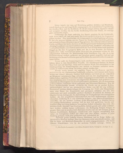 Ferner mufs der Semmeringæra noch zuerkannt werden, dafs auch Fell's Syftem fchon in dem Kraufs'fchen Projecte, die Zahnftangen- Bahnen im Staate New- York und auf dem Rigi, wenn auch in anderer Weife und abweichend in der Zahnkuppelung der Semmeringbahn und endlich in Patenten enthalten waren, welche an Oefterreicher fchon viel früher ertheilt worden find.