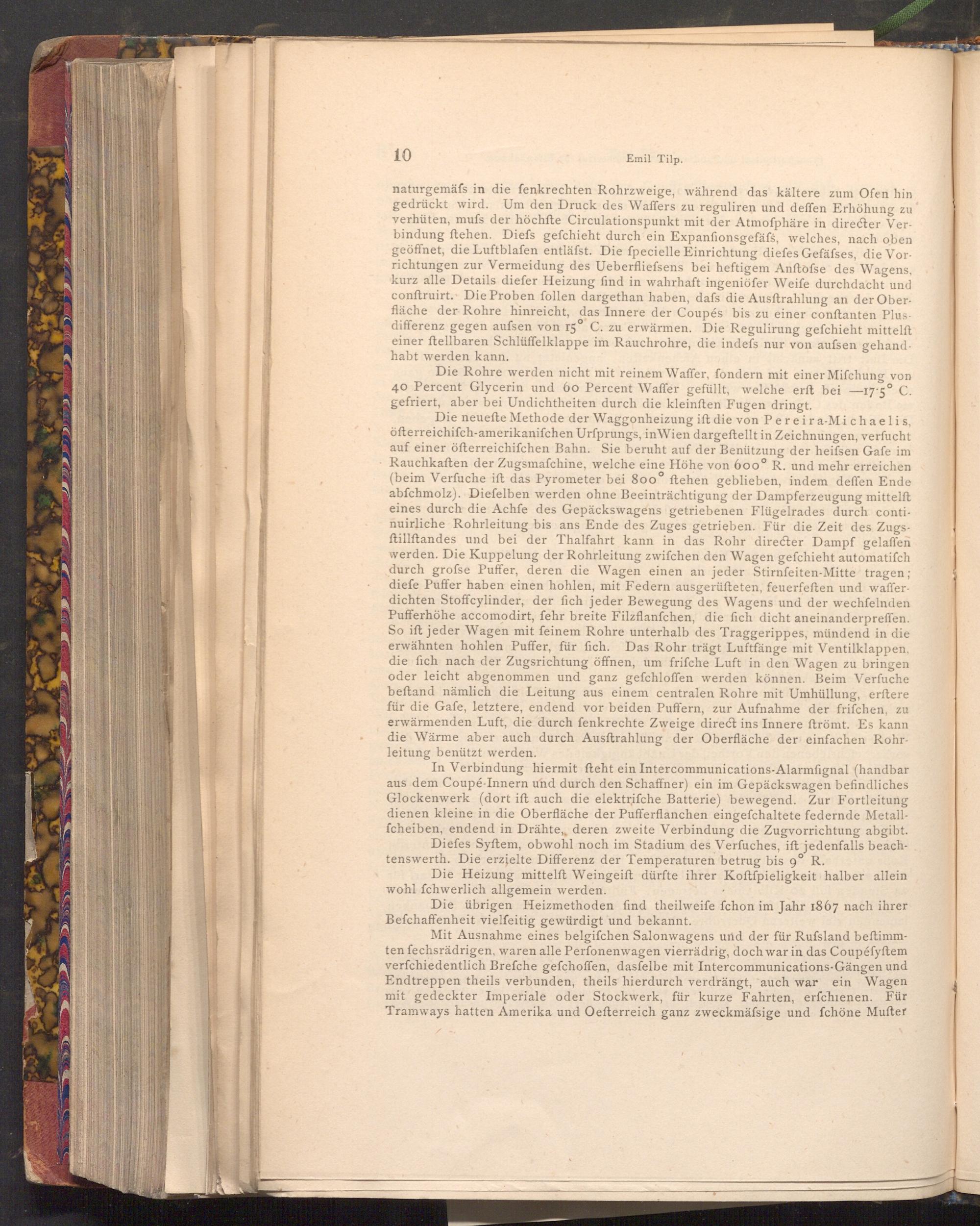 Die neuefte Methode der Waggonheizung ift die von Pereira- Michaelis, öfterreichiſch- amerikanifchen Urfprungs, inWien dargestellt in Zeichnungen, verfucht auf einer öfterreichifchen Bahn. Sie beruht auf der Benützung der heifsen Gafe im Rauchkaften der Zugsmafchine, welche eine Höhe von 600° R. und mehr erreichen ( beim Verfuche ift das Pyrometer bei 800 ftehen geblieben, indem deffen Ende abfchmolz). Diefelben werden ohne Beeinträchtigung der Dampferzeugung mittelft eines durch die Achfe des Gepäckswagens getriebenen Flügelrades durch continuirliche Rohrleitung bis ans Ende des Zuges getrieben. Für die Zeit des Zugsftillftandes und bei der Thalfahrt kann in das Rohr directer Dampf gelaffen werden. Die Kuppelung der Rohrleitung zwifchen den Wagen gefchieht automatifch durch grofse Puffer, deren die Wagen einen an jeder Stirnfeiten- Mitte tragen; diefe Puffer haben einen hohlen, mit Federn ausgerüfteten, feuerfeften und wafferdichten Stoffcylinder, der fich jeder Bewegung des Wagens und der wechfelnden Pufferhöhe accomodirt, fehr breite Filzflanfchen, die fich dicht aneinanderpreffen. So ift jeder Wagen mit feinem Rohre unterhalb des Traggerippes, mündend in die erwähnten hohlen Puffer, für fich. Das Rohr trägt Luftfänge mit Ventilklappen, die fich nach der Zugsrichtung öffnen, um frifche Luft in den Wagen zu bringen oder leicht abgenommen und ganz gefchloffen werden können. Beim Verfuche beftand nämlich die Leitung aus einem centralen Rohre mit Umhüllung, erſtere für die Gafe, letztere, endend vor beiden Puffern, zur Aufnahme der frifchen, zu erwärmenden Luft, die durch fenkrechte Zweige direct ins Innere ftrömt. Es kann die Wärme aber auch durch Ausftrahlung der Oberfläche der einfachen Rohrleitung benützt werden.