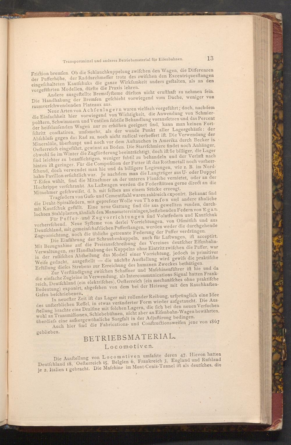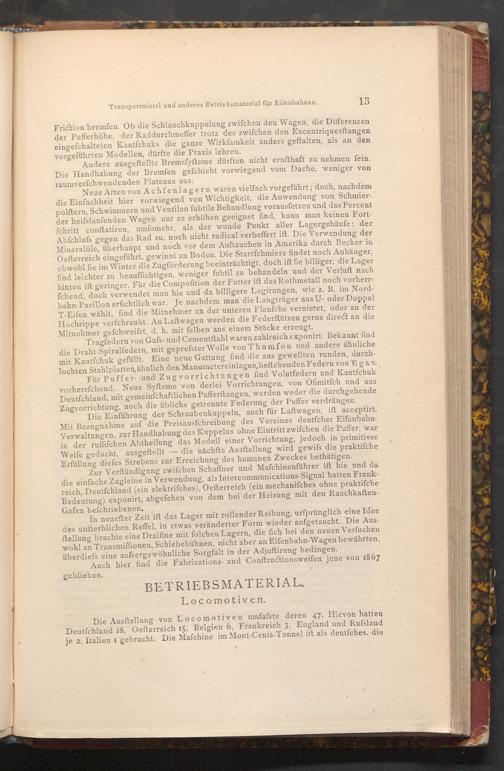 Die Ausstellung von Locomotiven umfafste deren 47. Hievon hatten Deutſchland 18, Oefterreich 15, Belgien 6, Frankreich 3, England und Rufsland je 2, Italien I gebracht. Die Mafchine im Mont- Cenis- Tunnel ift als deutfches. die