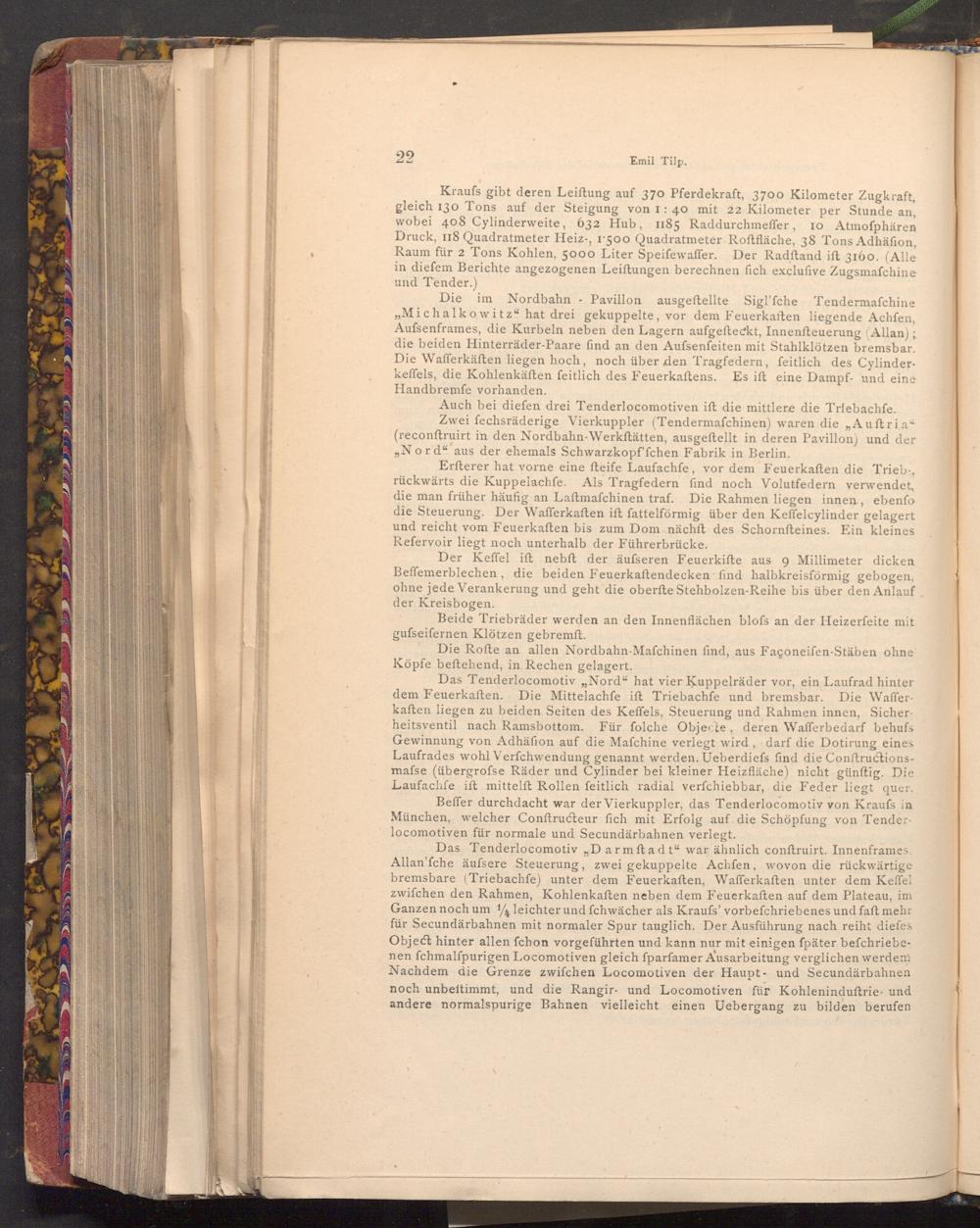 Kraufs gibt deren Leiftung auf 370 Pferdekraft, 3700 Kilometer Zugkraft, gleich 130 Tons auf der Steigung von I: 40 mit 22 Kilometer per Stunde an, wobei 408 Cylinderweite, 632 Hub, 1185 Raddurchmeffer, 10 Atmoſphären Druck, 118 Quadratmeter Heiz-, 1500 Quadratmeter Roftfläche, 38 Tons Adhäfion, Raum für 2 Tons Kohlen, 5000 Liter Speifewaffer. Der Radftand ift 3160.( Alle in diefem Berichte angezogenen Leiftungen berechnen fich exclufive Zugsmaschine und Tender.)