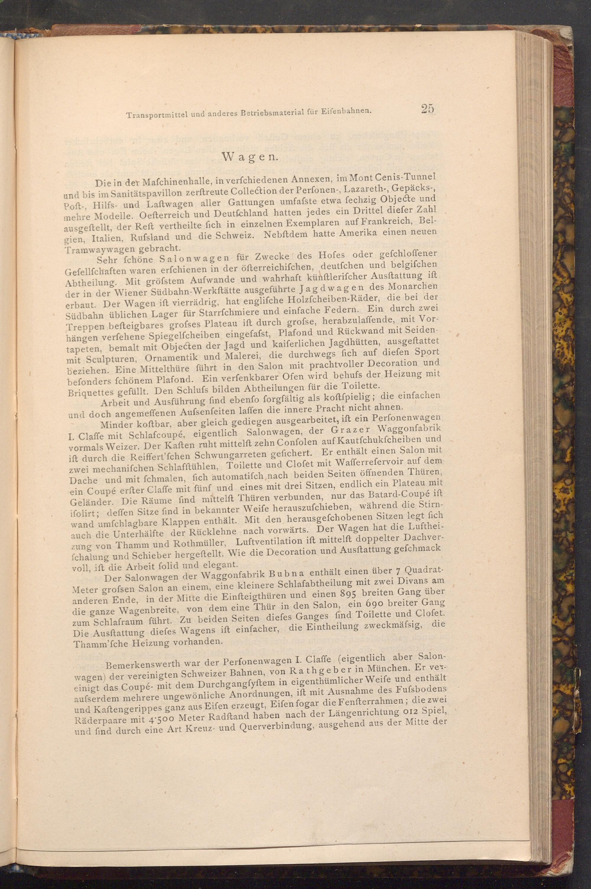 Die in der Mafchinenhalle, in verfchiedenen Annexen, im Mont Cenis- Tunnel und bis im Sanitätspavillon zerftreute Collection der Perfonen-, Lazareth-, Gepäcks-, Poft, Hilfs- und Laftwagen aller Gattungen umfafste etwa fechzig Objecte und mehre Modelle. Oefterreich und Deutfchland hatten jedes ein Drittel diefer Zahl ausgeftellt, der Reft vertheilte fich in einzelnen Exemplaren auf Frankreich, Belgien, Italien, Rufsland und die Schweiz. Nebftdem hatte Amerika einen neuen Tramwaywagen gebracht.