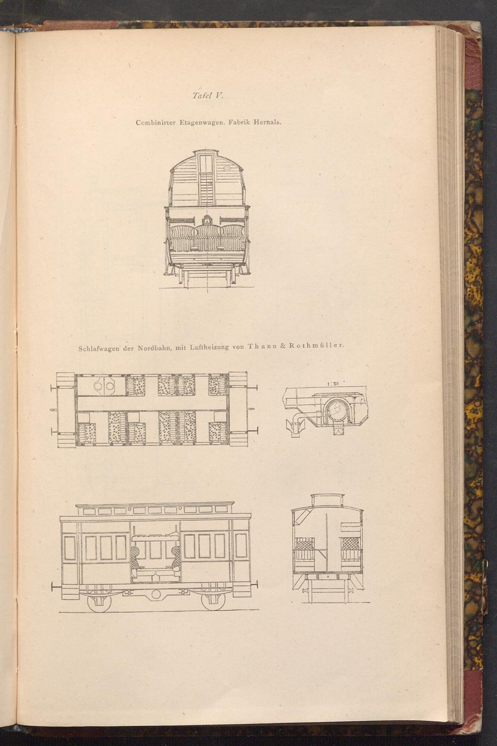 Tafel V. Combinirter Etagenwagen. Fabrik Hernals. Schlafwagen der Nordbahn, mit Luftheizung von Th ann& Rothmüller. 1:20 H