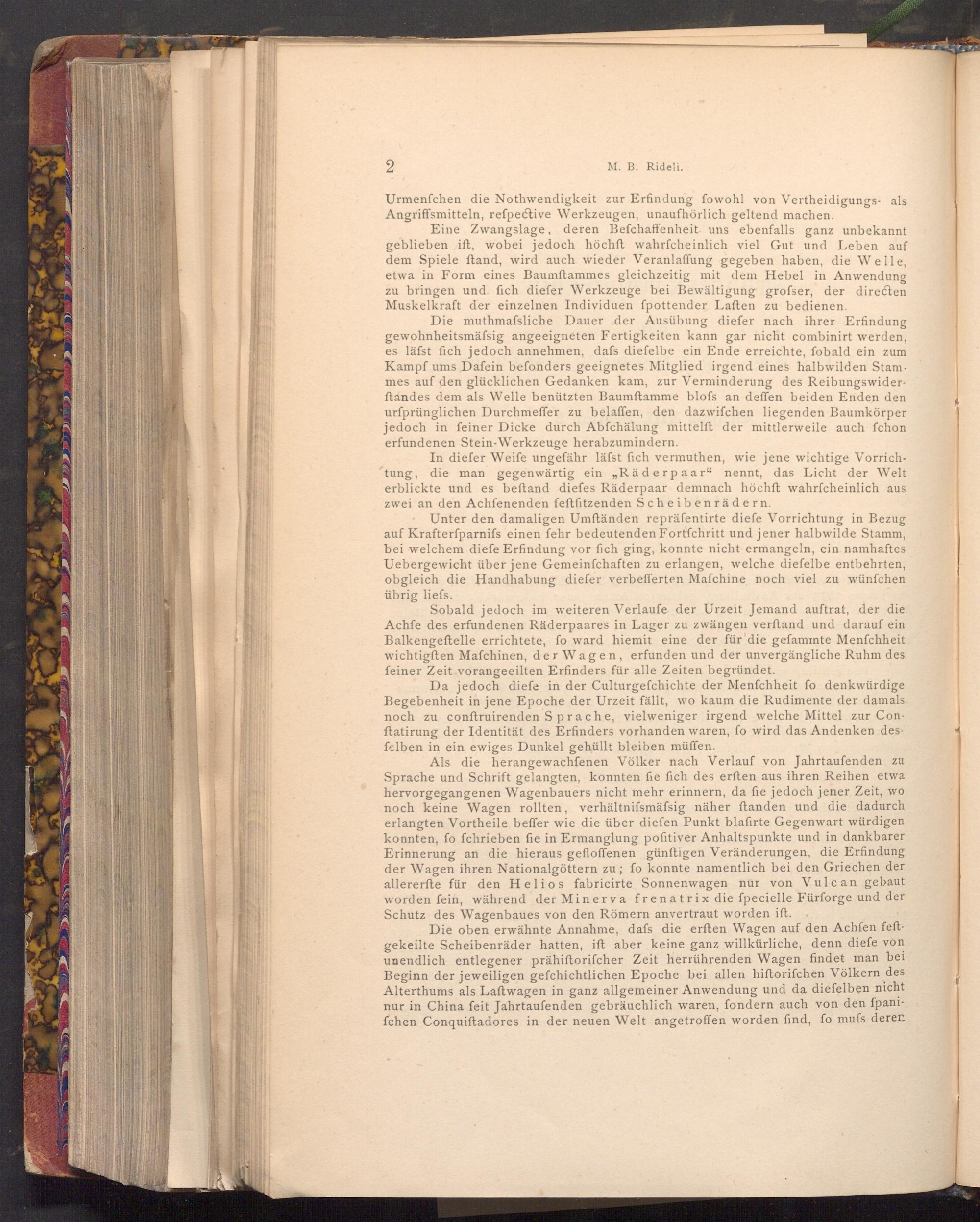 Als die herangewachfenen Völker nach Verlauf von Jahrtaufenden zu Sprache und Schrift gelangten, konnten fie fich des erften aus ihren Reihen etwa hervorgegangenen Wagenbauers nicht mehr erinnern, da fie jedoch jener Zeit, wo noch keine Wagen rollten, verhältnifsmäfsig näher ftanden und die dadurch erlangten Vortheile beffer wie die über diefen Punkt blafirte Gegenwart würdigen konnten, fo fchrieben fie in Ermanglung pofitiver Anhaltspunkte und in dankbarer Erinnerung an die hieraus gefloffenen günftigen Veränderungen, die Erfindung der Wagen ihren Nationalgöttern zu; fo konnte namentlich bei den Griechen der allererfte für den Helios fabricirte Sonnenwagen nur von Vulcan gebaut worden fein, während der Minerva frenatrix die fpecielle Fürforge und der Schutz des Wagenbaues von den Römern anvertraut worden ift.