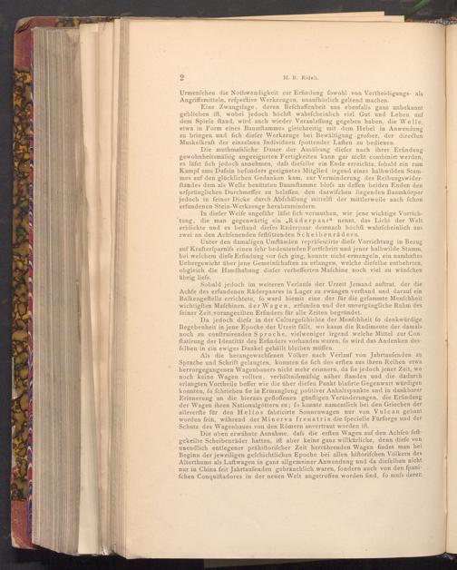 Sobald jedoch im weiteren Verlaufe der Urzeit Jemand auftrat, der die Achfe des erfundenen Räderpaares in Lager zu zwängen verftand und darauf ein Balkengeftelle errichtete, fo ward hiemit eine der für die gefaminte Menfchheit wichtigften Mafchinen, der Wagen, erfunden und der unvergängliche Ruhm des feiner Zeit vorange eilten Erfinders für alle Zeiten begründet.