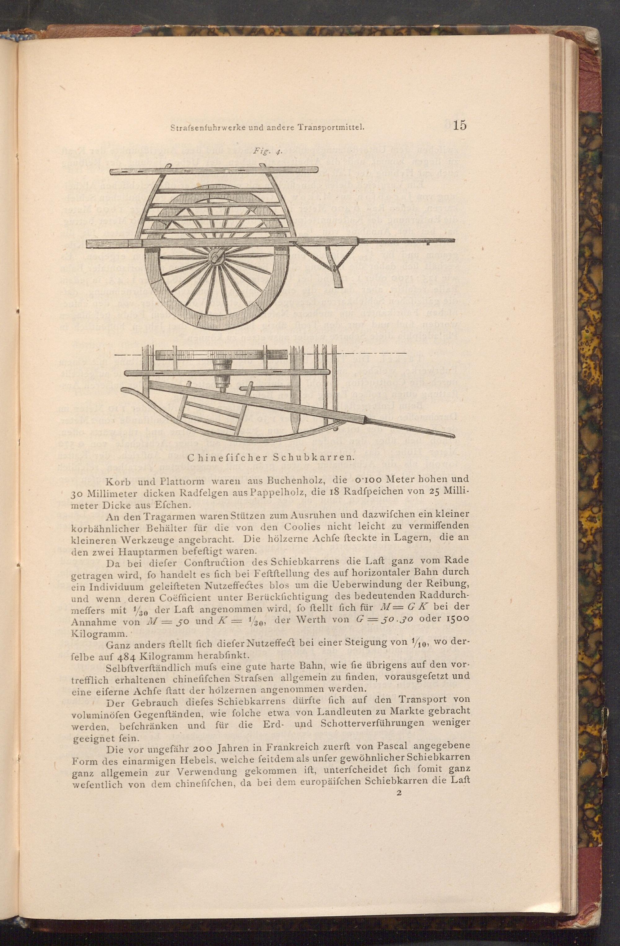 Selbſtverſtändlich mufs eine gute harte Bahn, wie fie übrigens auf den vortrefflich erhaltenen chinefifchen Strafsen allgemein zu finden, vorausgefetzt und eine eiferne Achfe ftatt der holzernen angenommen werden.