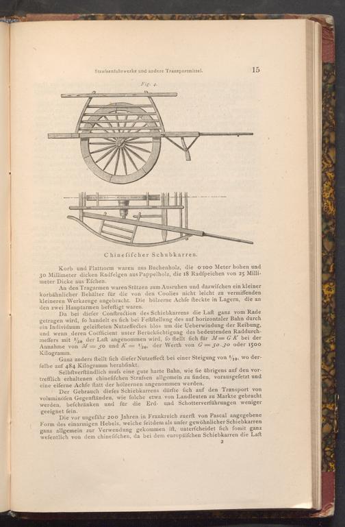 Die vor ungefähr 200 Jahren in Frankreich zuerft von Pascal angegebene Form des einarmigen Hebels, welche feitdem als unfer gewöhnlicher Schiebkarren ganz allgemein zur Verwendung gekommen ift, unterfcheidet fich fomit ganz wefentlich von dem chinefifchen, da bei dem europäifchen Schiebkarren die Laft