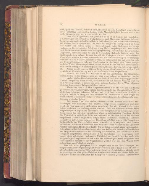 Unter den vom k. k. Hof Wagenfabrikanten Carl Marius zur Ausstellung gekommenen 10 Luxuswagen, welche den Glanzpunkt der öfterreichifchen Wagen abtheilung bildeten, befanden fich zwei mit je 8 Federn verfehene Hof- Galawagen, welche in Bezug auf ihre bedeutenden Dimenfionen als auch wegen der künftlerifchen Zuſammenſtellung der Decorationselemente die allgemeinfte Anerkennung gefunden haben.